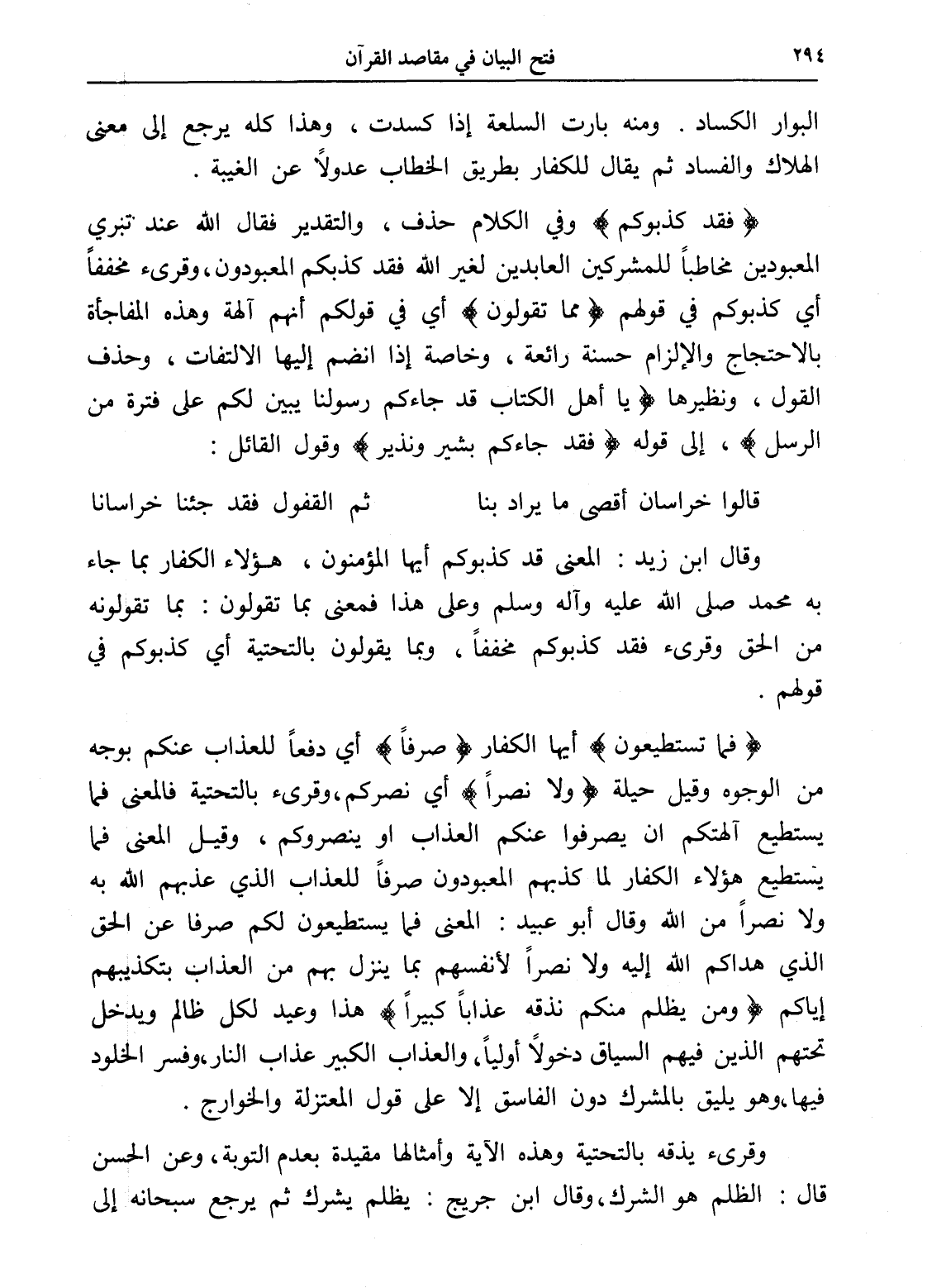 (فقد كذبوكم) وفي الكلام حذف، والتقدير فقال الله عند تبري المعبودين مخاطباً للمشركين العابدين لغير الله فقد كذبكم المعبودون، وقرئ مخففاً أي كذبوكم في قولهم (مما تقولون) أي في قولكم أنهم آلهة وهذه المفاجأة بالاحتجاج والإلزام حسنة رائعة، وخاصة إذا انضم إليها الالتفات، وحذف القول، ونظيرها (يا أهل الكتاب قد جاءكم رسولنا يبين لكم على فترة من الرسل)، إلى قوله (فقد جاءكم بشير ونذير) وقول القائل: