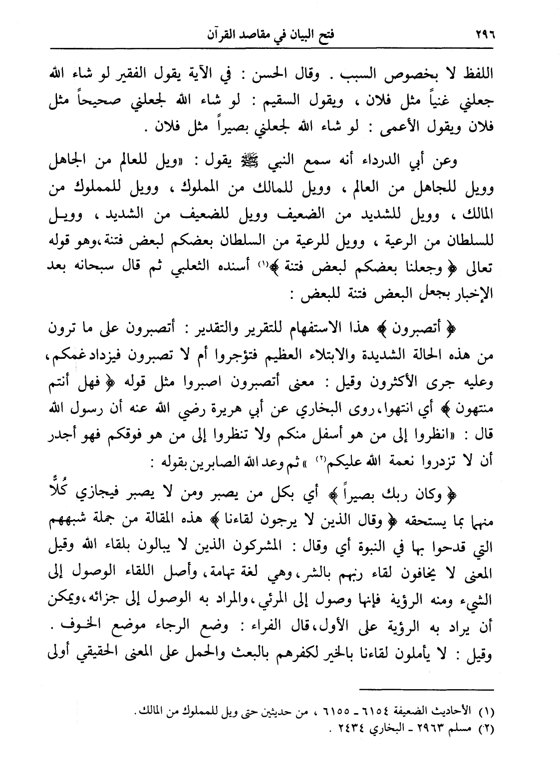 وعن أبي الدرداء أنه سمع النبي - صلى الله عليه وسلم - يقول: " ويل للعالم من الجاهل وويل للجاهل من العالم، وويل للمالك من المملوك، وويل للمملوك من المالك، وويل للشديد من الضعيف وويل للضعيف من الشديد، وويل للسلطان من الرعية، وويل للرعية من السلطان بعضكم لبعض فتنة، وهو قوله تعالى (وجعلنا بعضكم لبعض فتنة) (¬1) " أسنده الثعلبي ثم قال سبحانه بعد الإخبار بجعل البعض فتنة للبعض: