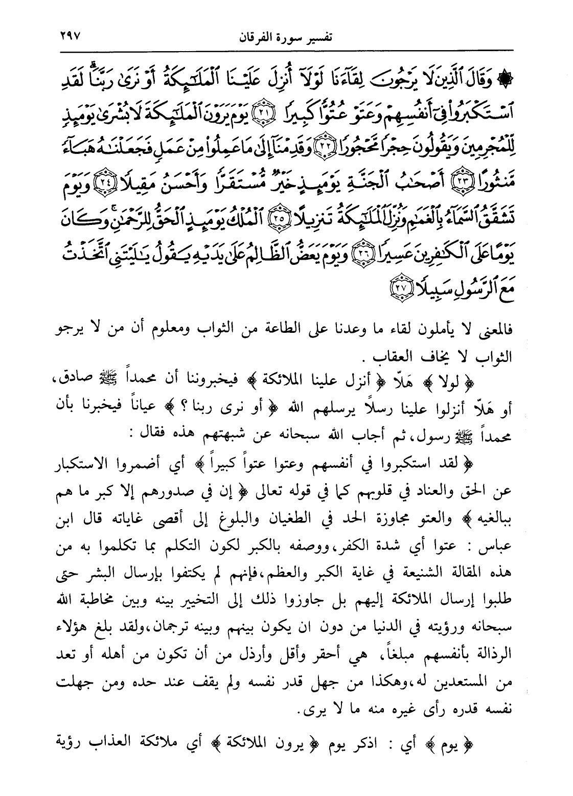 وَقَالَ الَّذِينَ لَا يَرْجُونَ لِقَاءَنَا لَوْلَا أُنْزِلَ عَلَيْنَا الْمَلَائِكَةُ أَوْ نَرَى رَبَّنَا لَقَدِ اسْتَكْبَرُوا فِي أَنْفُسِهِمْ وَعَتَوْا عُتُوًّا كَبِيرًا (21) يَوْمَ يَرَوْنَ الْمَلَائِكَةَ لَا بُشْرَى يَوْمَئِذٍ لِلْمُجْرِمِينَ وَيَقُولُونَ حِجْرًا مَحْجُورًا (22) وَقَدِمْنَا إِلَى مَا عَمِلُوا مِنْ عَمَلٍ فَجَعَلْنَاهُ هَبَاءً مَنْثُورًا (23) أَصْحَابُ الْجَنَّةِ يَوْمَئِذٍ خَيْرٌ مُسْتَقَرًّا وَأَحْسَنُ مَقِيلًا (24) وَيَوْمَ تَشَقَّقُ السَّمَاءُ بِالْغَمَامِ وَنُزِّلَ الْمَلَائِكَةُ تَنْزِيلًا (25) الْمُلْكُ يَوْمَئِذٍ الْحَقُّ لِلرَّحْمَنِ وَكَانَ يَوْمًا عَلَى الْكَافِرِينَ عَسِيرًا (26) وَيَوْمَ يَعَضُّ الظَّالِمُ عَلَى يَدَيْهِ يَقُولُ يَا لَيْتَنِي اتَّخَذْتُ مَعَ الرَّسُولِ سَبِيلًا (27)