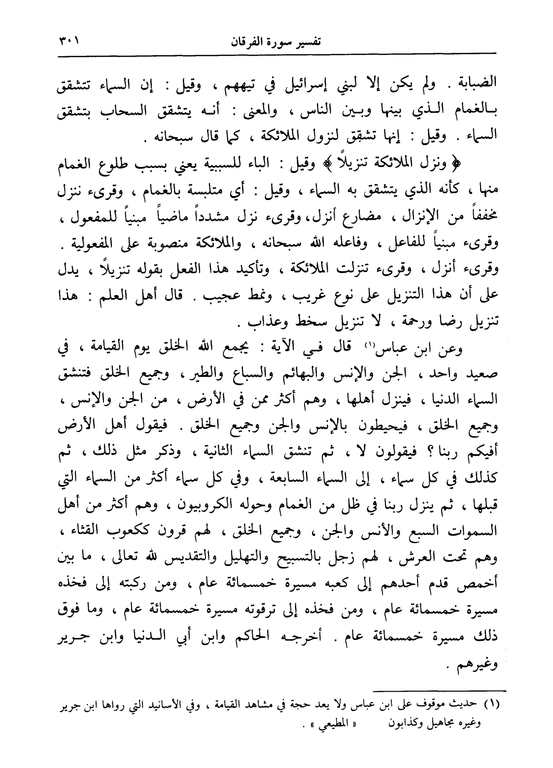 (ونزل الملائكة تنزيلاً) وقيل: الباء للسببية يعني بسبب طلوع الغمام منها، كأنه الذي يتشقق به السماء، وقيل: أي متلبسة بالغمام، وقرئ ننزل مخففاً من الإنزال، مضارع أنزل، وقرئ نزل مشدداً ماضياً مبنياً للمفعول، وقرئ مبنياً للفاعل، وفاعله الله سبحانه، والملائكة منصوبة على المفعولية. وقرئ أنزل، وقرئ تنزلت الملائكة، وتأكيد هذا الفعل بقوله تنزيلاً، يدل على أن هذا التنزيل على نوع غريب، ونمط عجيب. قال أهل العلم: هذا تنزيل رضا ورحمة، لا تنزيل سخط وعذاب.