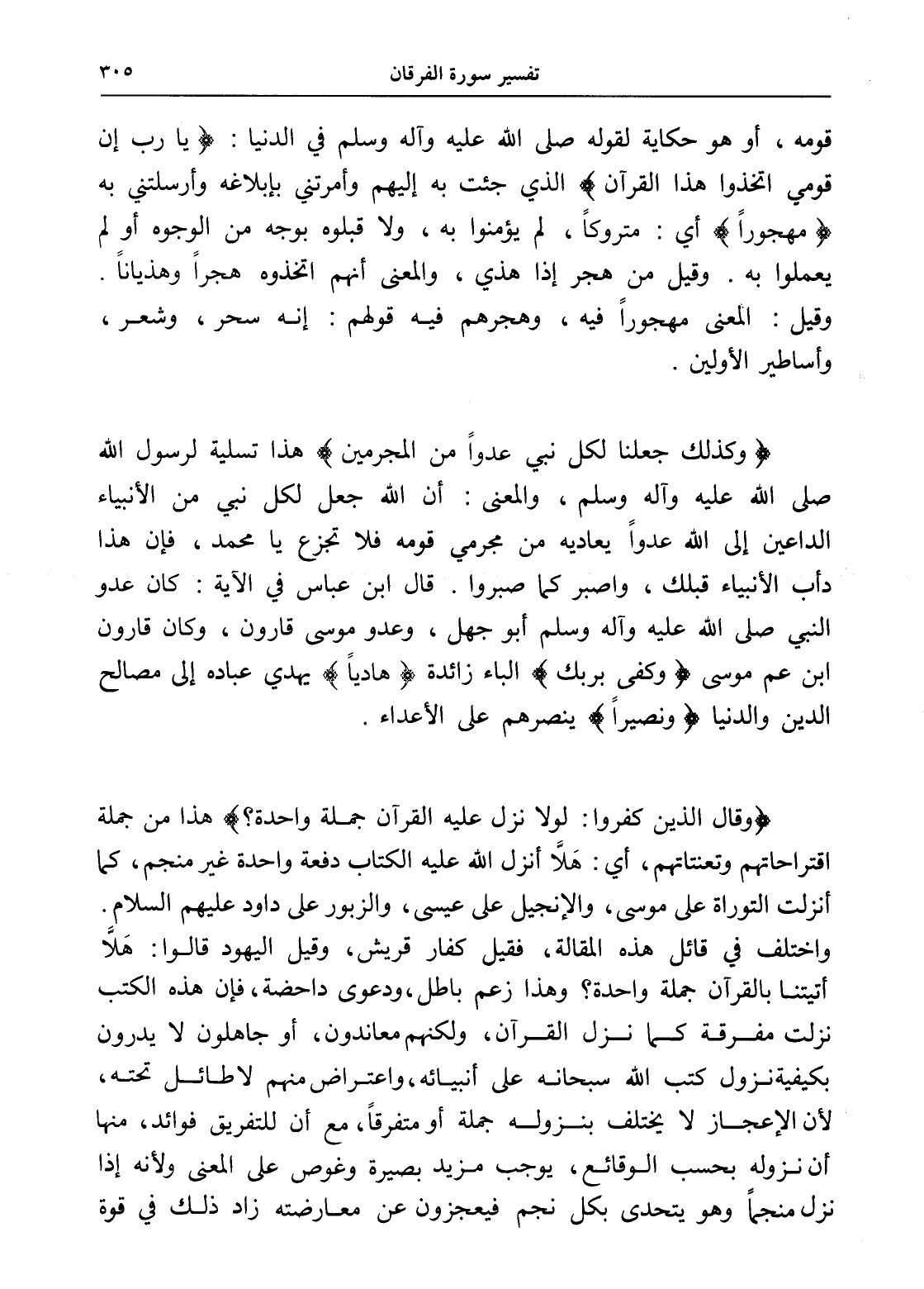 (وقال الذين كفروا لولا نزل عليه القرآن جملة واحدة)؟ هذا من جملة اقتراحاتهم وتعنتاتهم، أي: هَلاَّ أنزل الله عليه الكتاب دفعة واحدة غير منجم، كما أنزلت التوراة على موسى، والإنجيل على عيسى، والزبور على داود عليهم السلام. واختلف في قائل هذه المقالة، فقيل كفار قريش، وقيل اليهود قالوا: هَلاَّ أتيتنا بالقرآن جملة واحدة؟ وهذا زعم باطل، ودعوى داحضة، فإن هذه الكتب نزلت مفرقة كما نزل القرآن، ولكنهم معاندون، أو جاهلون لا يدرون بكيفية نزول كتب الله سبحانه على أنبيائه، واعتراض منهم لا طائل تحته، لأن الإعجاز لا يختلف بنزوله جملة أو متفرقاً، مع أن للتفريق فوائد، منها أن نزوله بحسب الوقائع، يوجب مزيد بصيرة وغوص على المعنى ولأنه إذا نزل منجماً وهو يتحدى بكل نجم فيعجزون عن معارضته زاد ذلك في قوة