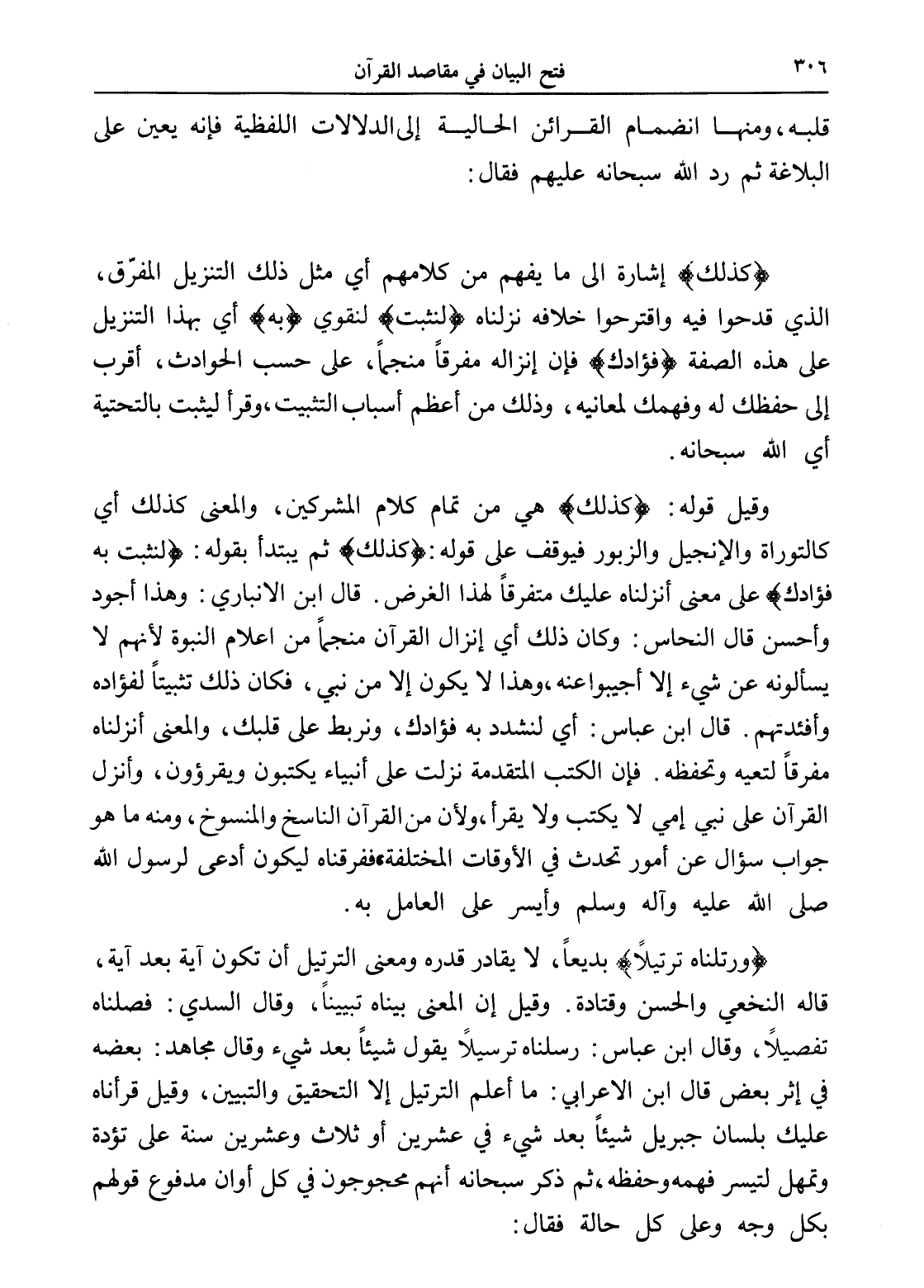 وقيل قوله: (كذلك) هي من تمام كلام المشركين، والمعنى كذلك أي كالتوراة والإنجيل والزبور فيوقف على قوله: (كذلك) ثم يبتدأ بقوله: (لنثبت به فؤادك) على معنى أنزلناه عليك متفرقاً لهذا الغرض. قال ابن الأنباري: وهذا أجود وأحسن قال النحاس: وكان ذلك أي إنزال القرآن منجماً من إعلام النبوة لأنهم لا يسألونه عن شيء إلا أجيبوا عنه، وهذا لا يكون إلا من نبي، فكان ذلك تثبيتاً لفؤاده وأفئدتهم. قال ابن عباس: أي لنشدد به فؤادك، ونربط على قلبك، والمعنى أنزلناه مفرقاً لتعيه وتحفظه. فإن الكتب المتقدمة نزلت على أنبياء يكتبون ويقرؤون، وأنزل القرآن على نبي إمي لا يكتب ولا يقرأ، ولأن من القرآن الناسخ والنسوخ، ومنه ما هو جواب سؤال عن أمور تحدث في الأوقات المختلفة، ففرقناه ليكون أدعى لرسول الله صلى الله عليه وآله وسلم وأيسر على العامل به.