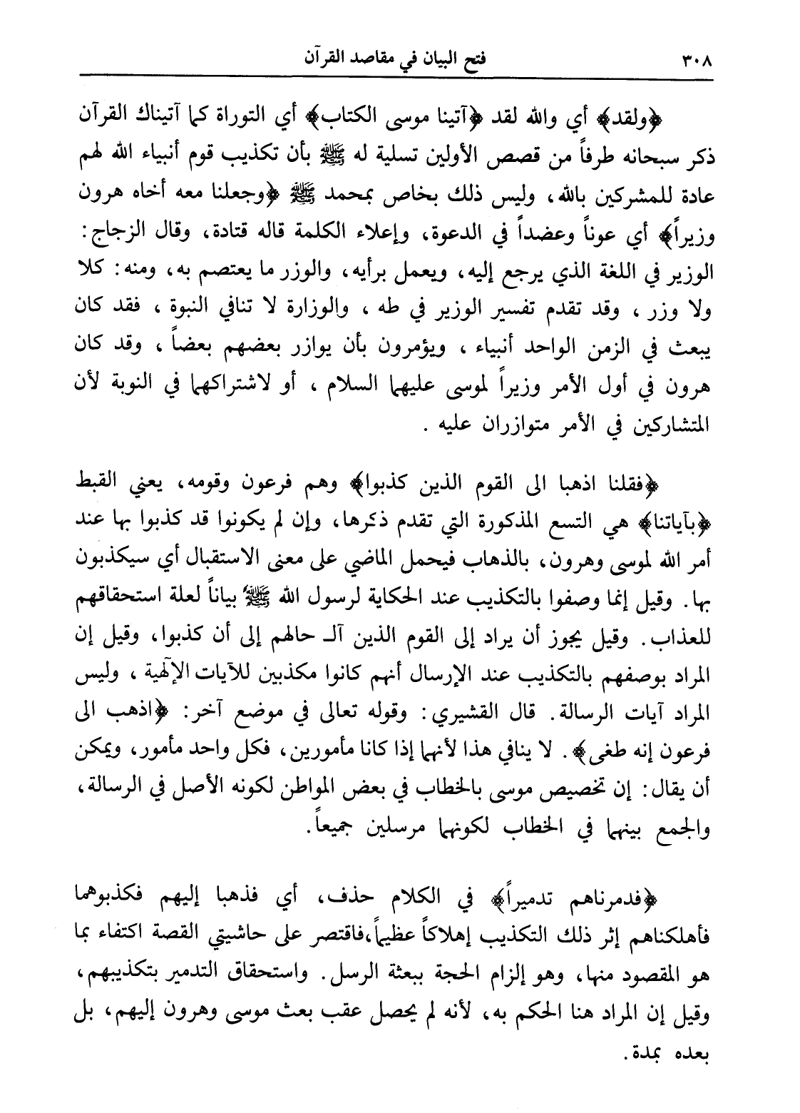 (ولقد) أي والله لقد (آتينا موسى الكتاب) أي التوراة كما آتيناك القرآن ذكر سبحانه طرفاً من قصص الأولين تسلية له - صلى الله عليه وسلم - بأن تكذيب قوم أنبياء الله لهم عادة للمشركين بالله، وليس ذلك بخاص بمحمد - صلى الله عليه وسلم - (وجعلنا معه أخاه هارون وزيراً) أي عوناً وعضداً في الدعوة، وإعلاء الكلمة قاله قتادة، وقال الزجاج: الوزير في اللغة الذي يرجع إليه، ويعمل برأيه، والوزر ما يعتصم به، ومنه: كلا ولا وزر، وقد تقدم تفسير الوزير في طه، والوزارة لا تنافي النبوة، فقد كان يبعث في الزمن الواحد أنبياء، ويؤمرون بأن يوازر بعضهم بعضاً، وقد كان هارون في أول الأمر وزيراً لموسى عليهما السلام، أو لاشتراكهما في النوبة لأن المتشاركين في الأمر متوازران عليه.