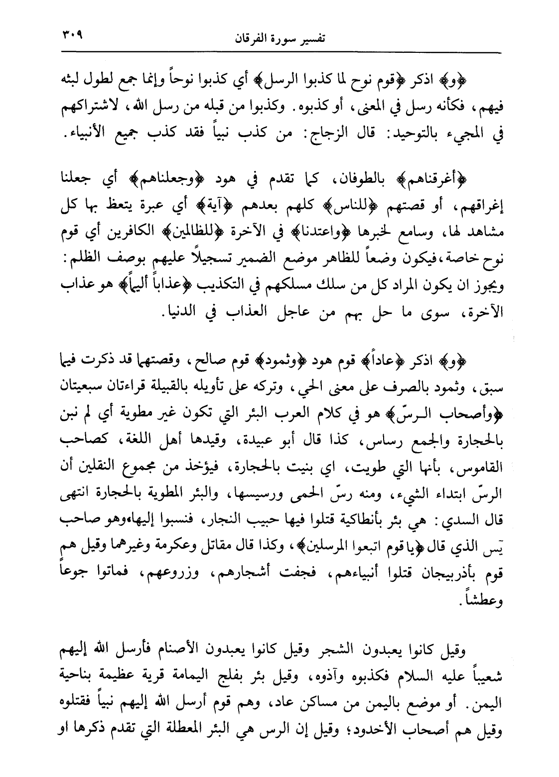 (و) اذكر (عاداً) قوم هود (وثمود) قوم صالح، وقصتهما قد ذكرت فيما سبق، وثمود بالصرف على معنى الحي، وتركه على تأويله بالقبيلة قراءتان سبعيتان (وأصحاب الرسّ) هو في كلام العرب البئر التي تكون غير مطوية أي لم نبن بالحجارة والجمع رساس، كذا قال أبو عبيدة، وقيدها أهل اللغة، كصاحب القاموس، بأنها التي طويت، أي بنيت بالحجارة، فيؤخذ من مجموع النقلين أن الرسّ ابتداء الشيء، ومنه رسّ الحمى ورسيسها، والبئر المطوية بالحجارة انتهى قال السدي: هي بئر بأنطاكية قتلوا فيها حبيب النجار، فنسبوا إليها، وهو صاحب يس الذي قال (يا قوم اتبعوا المرسلين)، وكذا قال مقاتل وعكرمة وغيرهما وقيل هم قوم بأذربيجان قتلوا أنبياءهم، فجفت أشجارهم، وزروعهم، فماتوا جوعاً وعطشاً.