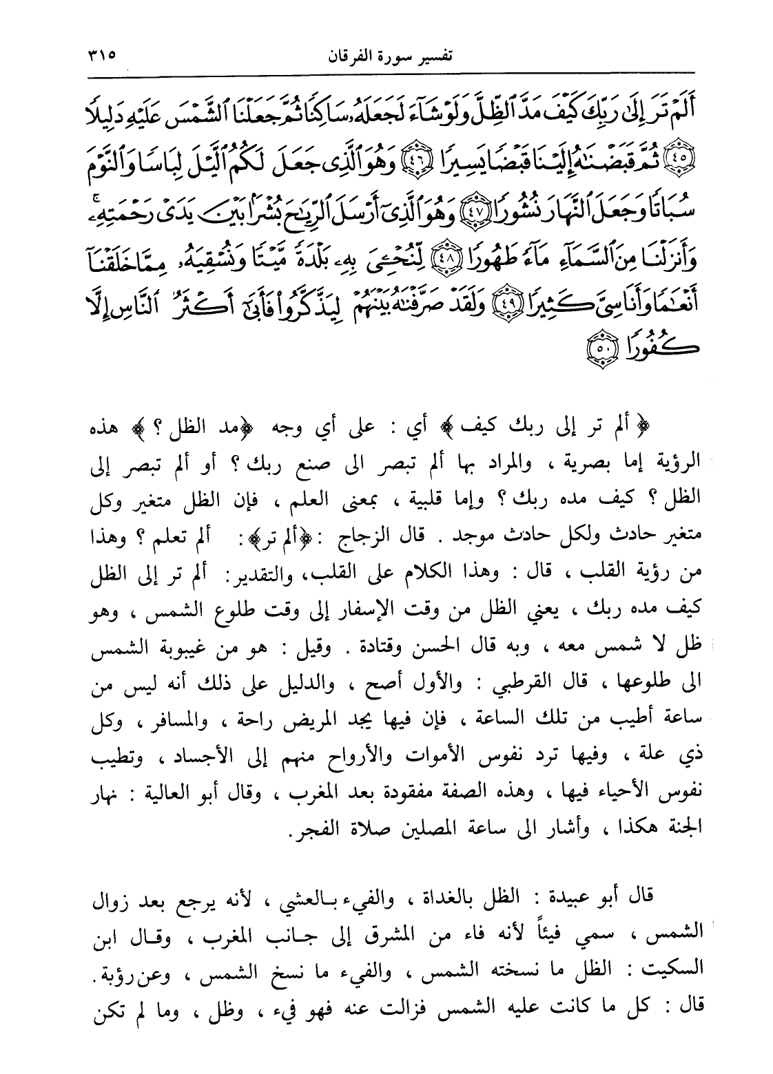 أَلَمْ تَرَ إِلَى رَبِّكَ كَيْفَ مَدَّ الظِّلَّ وَلَوْ شَاءَ لَجَعَلَهُ سَاكِنًا ثُمَّ جَعَلْنَا الشَّمْسَ عَلَيْهِ دَلِيلًا (45) ثُمَّ قَبَضْنَاهُ إِلَيْنَا قَبْضًا يَسِيرًا (46) وَهُوَ الَّذِي جَعَلَ لَكُمُ اللَّيْلَ لِبَاسًا وَالنَّوْمَ سُبَاتًا وَجَعَلَ النَّهَارَ نُشُورًا (47) وَهُوَ الَّذِي أَرْسَلَ الرِّيَاحَ بُشْرًا بَيْنَ يَدَيْ رَحْمَتِهِ وَأَنْزَلْنَا مِنَ السَّمَاءِ مَاءً طَهُورًا (48) لِنُحْيِيَ بِهِ بَلْدَةً مَيْتًا وَنُسْقِيَهُ مِمَّا خَلَقْنَا أَنْعَامًا وَأَنَاسِيَّ كَثِيرًا (49) وَلَقَدْ صَرَّفْنَاهُ بَيْنَهُمْ لِيَذَّكَّرُوا فَأَبَى أَكْثَرُ النَّاسِ إِلَّا كُفُورًا (50)