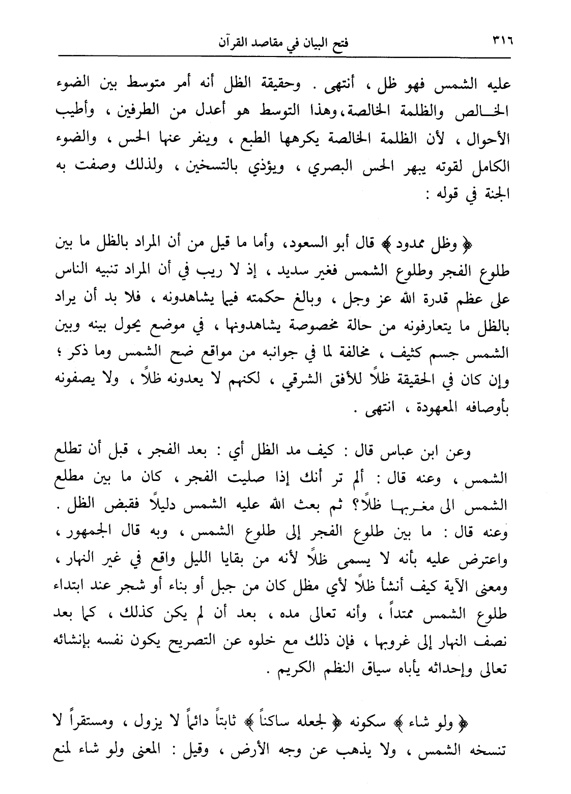 (وظل ممدود) قال أبو السعود، وأما ما قيل من أن المراد بالظل ما بين طلوع الفجر وطلوع الشمس فغير سديد، إذ لا ريب في أن المراد تنبيه الناس على عظم قدرة الله عز وجل، وبالغ حكمته فيما يشاهدونه، فلا بد أن يراد بالظل ما يتعارفونه من حالة مخصوصة يشاهدونها، في موضع يحول بينه وبين الشمس جسم كثيف، مخالفة لما في جوانبه من مواقع ضح الشمس وما ذكر؛ وإن كان في الحقيقة ظلاً للأفق الشرقي، لكنهم لا يعدونه ظلاً، ولا يصفونه بأوصافه المعهودة، انتهى.