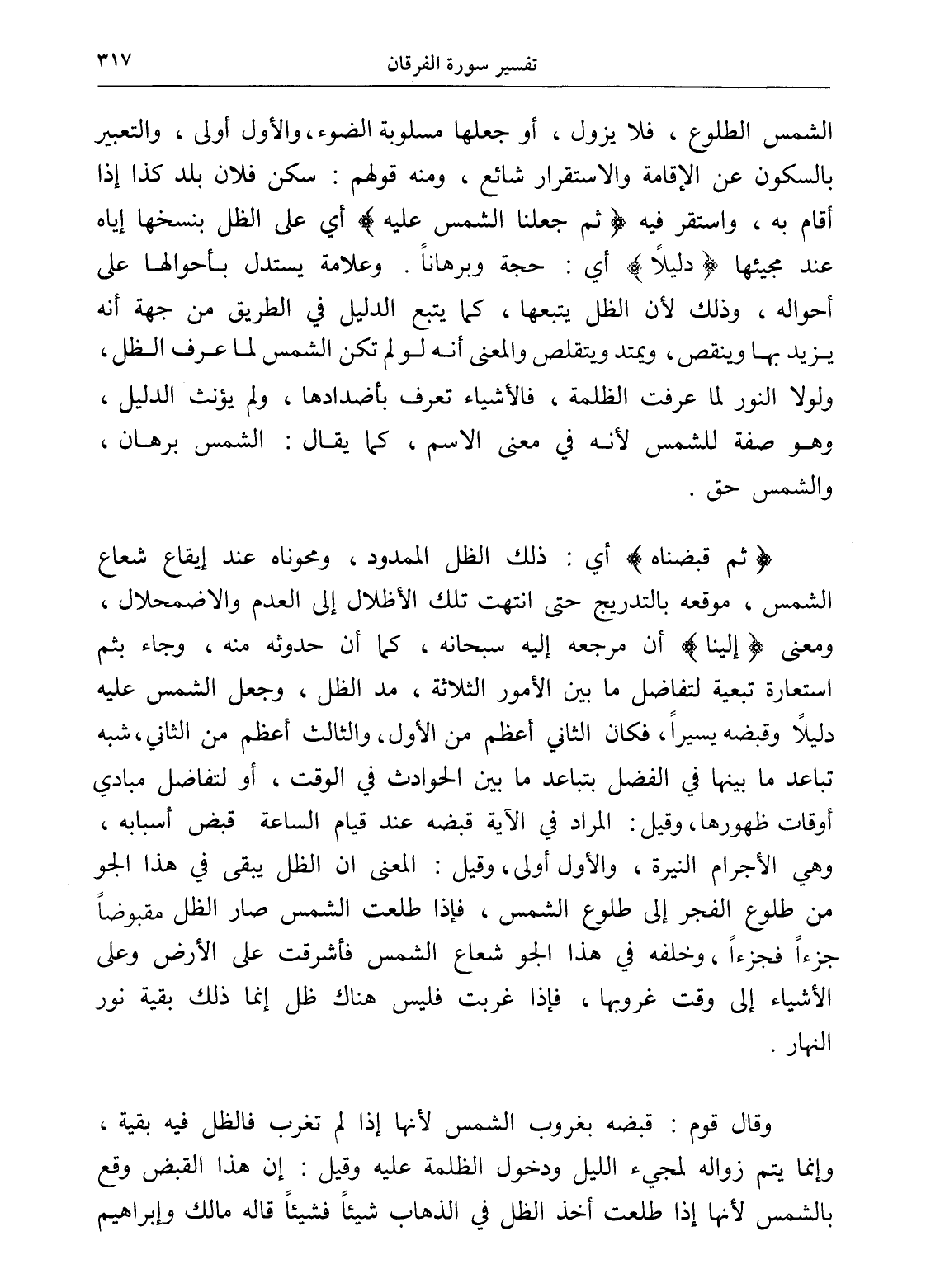وقال قوم: قبضه بغروب الشمس لأنها إذا لم تغرب فالظل فيه بقية، وإنما يتم زواله لمجيء الليل ودخول الظلمة عليه وقيل: إن هذا القبض وقع بالشمس لأنها إذا طلعت أخذ الظل في الذهاب شيئاًً فشيئاًً قاله مالك وإبراهيم
