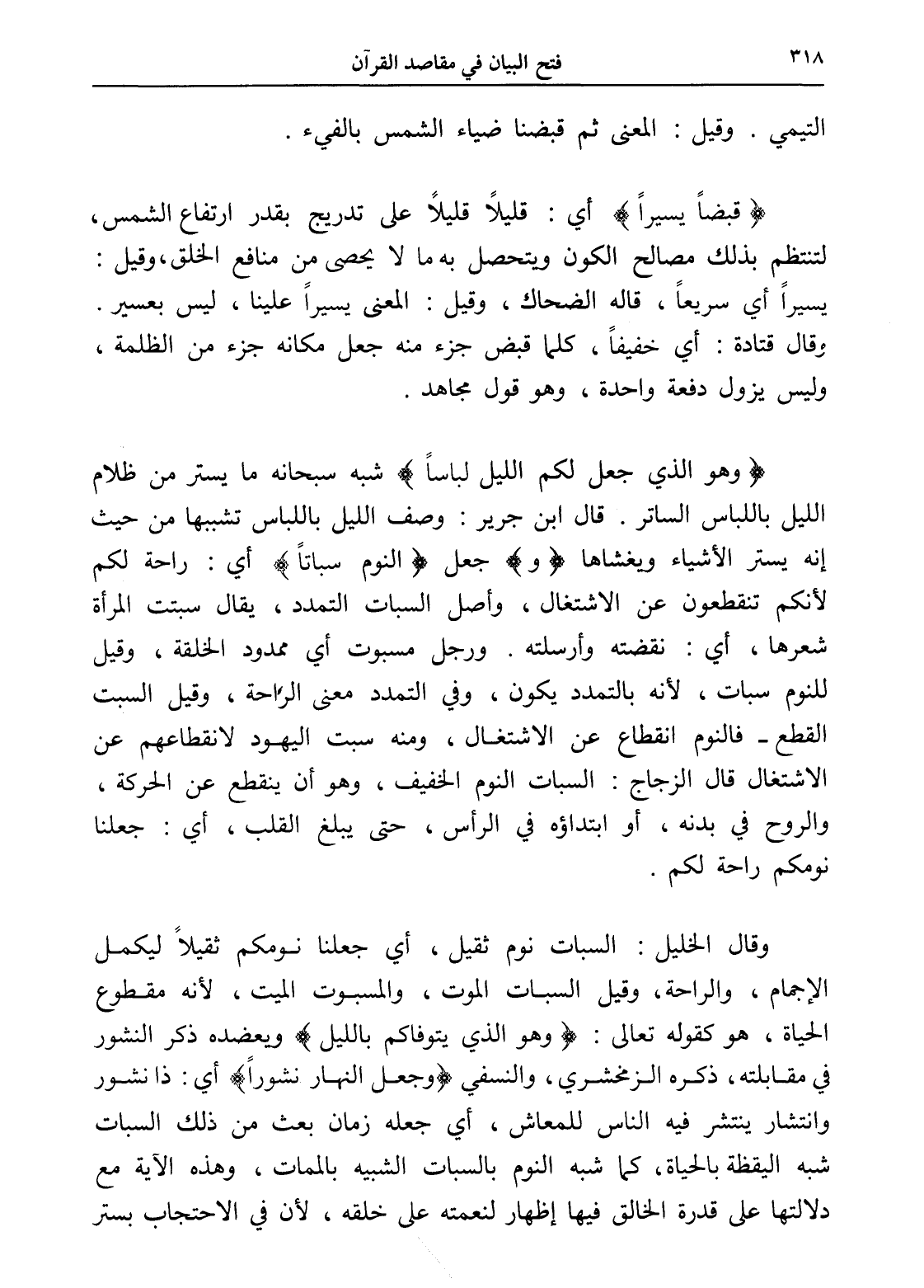 وقال الخليل: السبات نوم ثقيل، أي جعلنا نومكم ثقيلاً ليكمل الإجمام، والراحة، وقيل السبات الموت، والمسبوت الميت، لأنه مقطوع الحياة، هو كقوله تعالى: (وهو الذي يتوفاكم بالليل) ويعضده ذكر النشور في مقابلته، ذكره الزمخشري، والنسفي (وجعل النهار نشوراً) أي: ذا نشور وانتشار ينتشر فيه الناس للمعاش، أي جعله زمان بعث من ذلك السبات شبه اليقظة بالحياة، كما شبه النوم بالسبات الشبيه بالممات، وهذه الآية مع دلالتها على قدرة الخالق فيها إظهار لنعمته على خلقه، لأن في الاحتجاب بستر