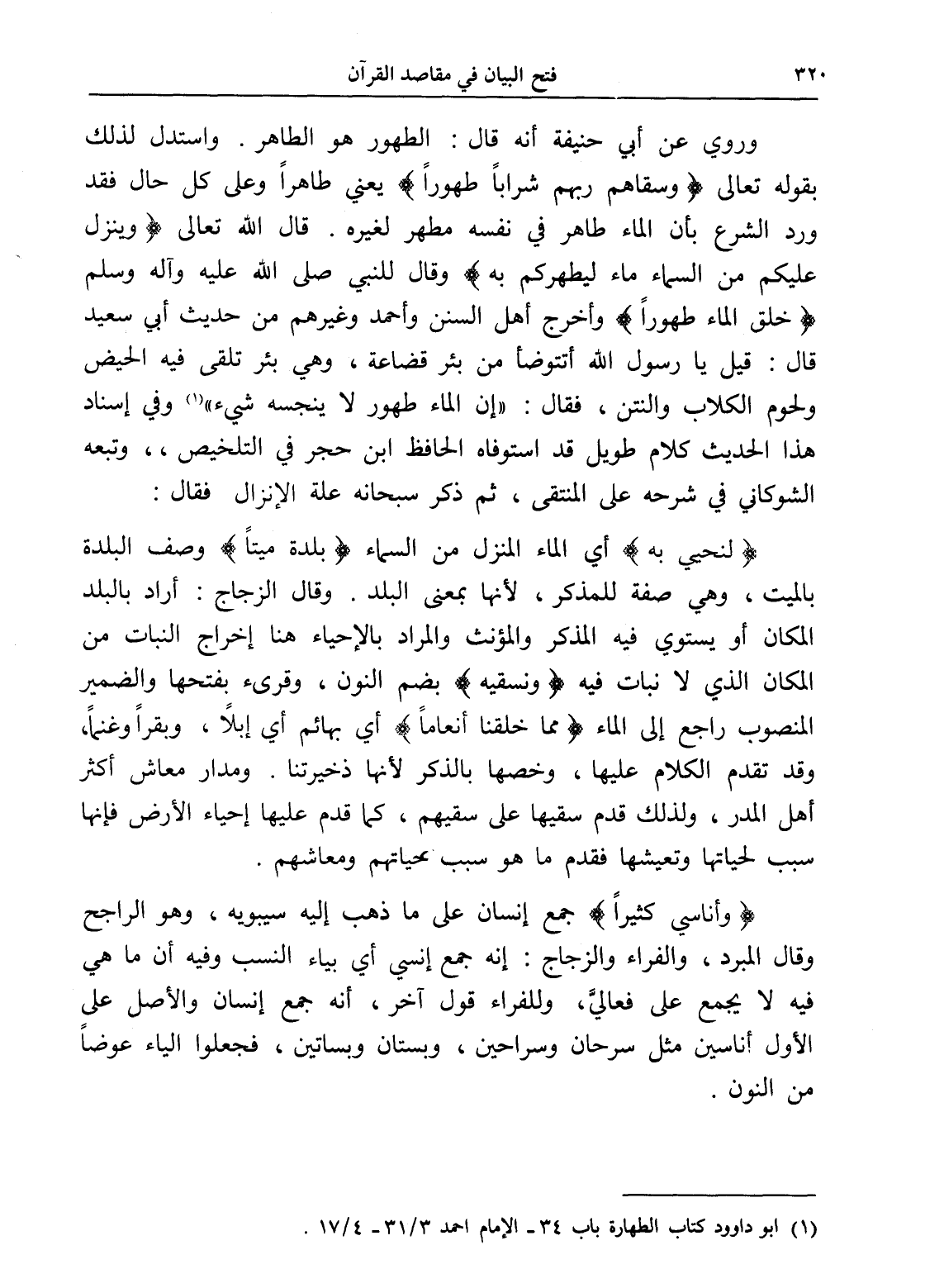 وروي عن أبي حنيفة أنه قال: الطهور هو الطاهر. واستدل لذلك بقوله تعالى (وسقاهم ربهم شراباً طهوراً) يعني طاهراً وعلى كل حال فقد ورد الشرع بأن الماء طاهر في نفسه مطهر لغيره. قال الله تعالى (وينزل عليكم من السماء ماء ليطهركم به) وقال للنبي صلى الله عليه وآله وسلم (خلق الماء طهوراً) وأخرج أهل السنن وأحمد وغيرهم من حديث أبي سعيد قال: قيل يا رسول الله أتتوضأ من بئر قضاعة، وهي بئر تلقى فيه الحيض ولحوم الكلاب والنتن، فقال: " إن الماء طهور لا ينجسه شيء " (¬1) وفي إسناد هذا الحديث كلام طويل قد استوفاه الحافظ ابن حجر في التلخيص، وتبعه الشوكاني في شرحه على المنتقى، ثم ذكر سبحانه علة الإنزال فقال: