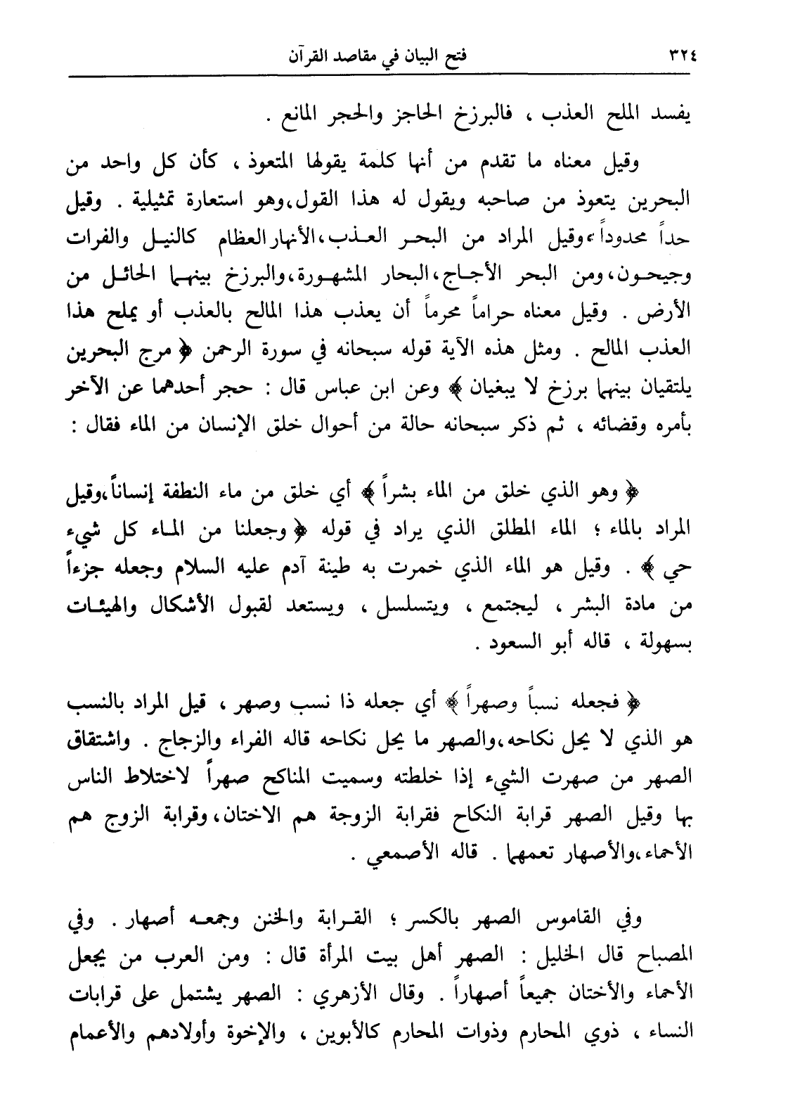 وقيل معناه ما تقدم من أنها كلمة يقولها المتعوذ، كان كل واحد من البحرين يتعوذ من صاحبه ويقول له هذا القول، وهو استعارة تمثيلية. وقيل حداً محدوداً، وقيل المراد من البحر العذب، الأنهار العظام كالنيل والفرات وجيحون، ومن البحر الأجاج، البحار المشهورة، والبرزخ بينهما الحائل من الأرض. وقيل معناه حراماً محرماً أن يعذب هذا المالح بالعذب أو يملح هذا العذب المالح. ومثل هذه الآية قوله سبحانه في سورة الرحمن (مرج البحرين يلتقيان بينهما برزخ لا يبغيان) وعن ابن عباس قال: حجر أحدهما عن الآخر بأمره وقضائه، ثم ذكر سبحانه حالة من أحوال خلق الإنسان من الماء فقال: