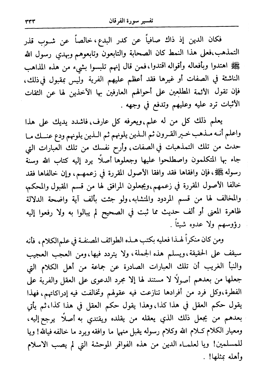 يعلم ذلك كل من له علم، ويعرفه كل عارف، فاشدد يديك على هذا واعلم أنه مذهب خير القرون ثم الذين يلونهم ثم الذين يلونهم ودع عنك ما حدث من تلك التمذهبات في الصفات، وأرح نفسك من تلك العبارات التي جاء بها المتكلمون واصطلحوا عليها وجعلوها أصلاً يرد إليه كتاب الله وسنة رسوله - صلى الله عليه وسلم -، فإن وافقاها فقد وافقا الأصول المقررة في زعمهم، وإن خالفاها فقد خالفا الأصول المقررة في زعمهم، ويجعلون المرافق لها من قسم المقبول والمحكم والمخالف لها من قسم المردود والمتشابه، ولو جئت بألف آية واضحة الدلالة ظاهرة المعنى أو ألف حديث مما ثبت في الصحيح لم يبالوا به ولا رفعوا إليه رؤوسهم ولا عدوه شيئاًً.