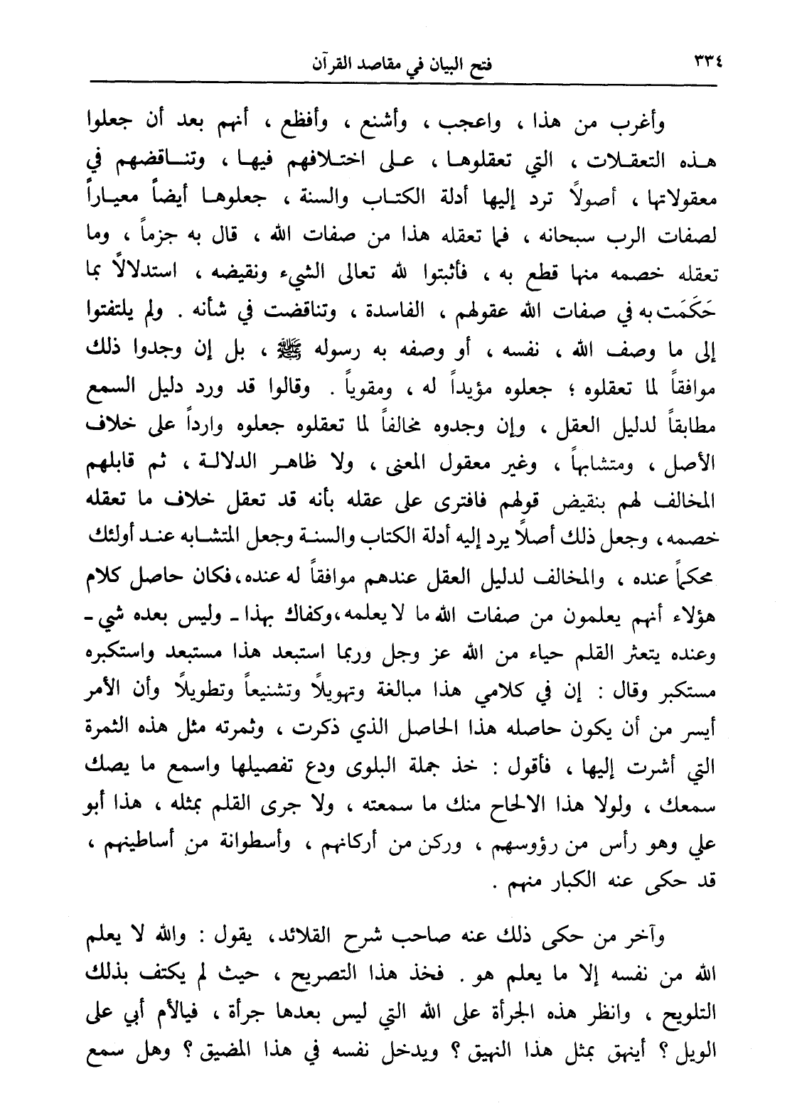 وآخر من حكى ذلك عنه صاحب شرح القلائد، يقول: والله لا يعلم الله من نفسه إلا ما يعلم هو. فخذ هذا التصريح، حيث لم يكتف بذلك التلويح، وانظر هذه الجرأة على الله التي ليس بعدها جرأة، فيالأم أبي على الويل؟ أينهق بمثل هذا النهيق؟ ويدخل نفسه في هذا المضيق؟ وهل سمع