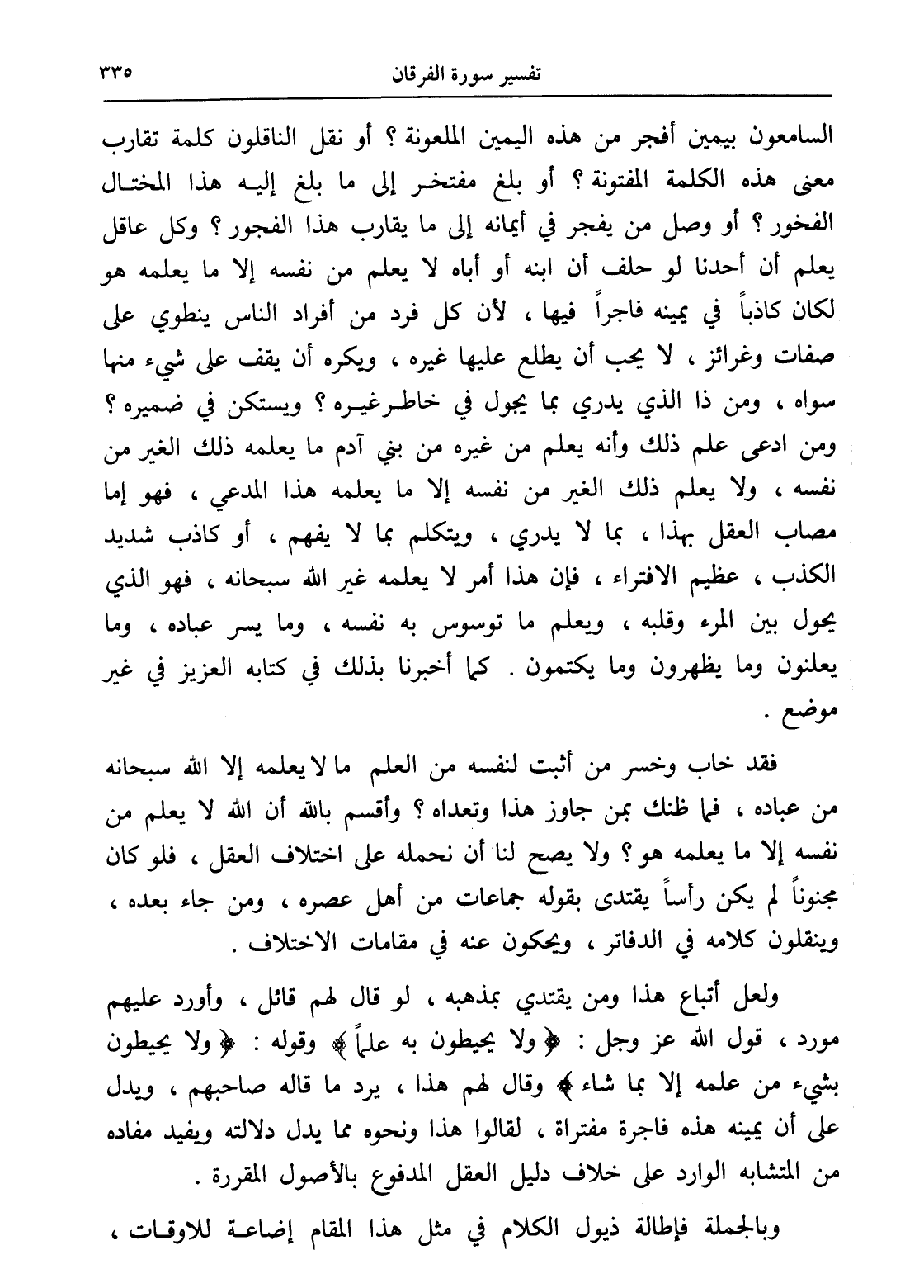 ولعل أتباع هذا ومن يقتدي بمذهبه، لو قال لهم قائل، وأورد عليهم مورد، قول الله عز وجل: (ولا يحيطون به علماً) وقوله: (ولا يحيطون بشيء من علمه إلا بما شاء) وقال لهم هذا، يرد ما قاله صاحبهم، ويدل على أن يمينه هذه فاجرة مفتراة، لقالوا هذا ونحوه مما يدل دلالته ويفيد مفاده من المتشابه الوارد على خلاف دليل العقل المدفوع بالأصول المقررة.