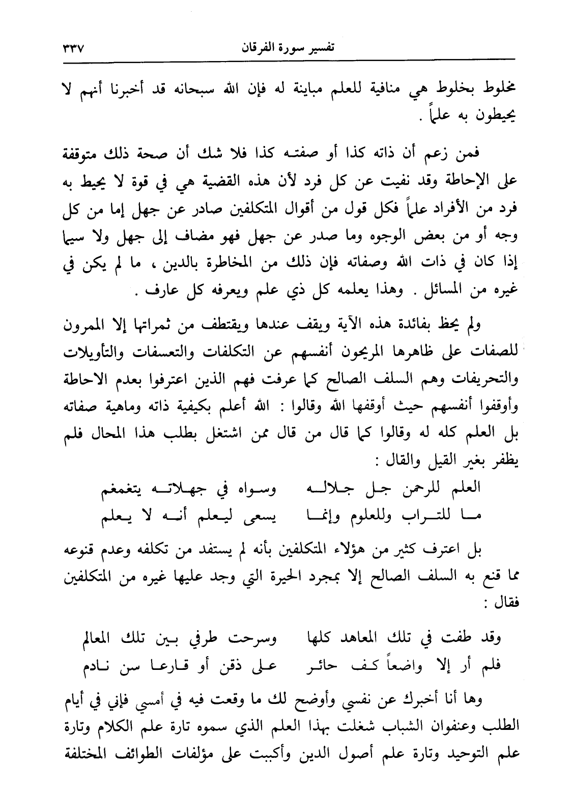 ولم يحظ بفائدة هذه الآية ويقف عندها ويقتطف من ثمراتها إلا الممرون للصفات على ظاهرها المريحون أنفسهم عن التكلفات والتعسفات والتأويلات والتحريفات وهم السلف الصالح كما عرفت فهم الذين اعترفوا بعدم الإحاطة وأوقفوا أنفسهم حيث أوقفها الله وقالوا: الله أعلم بكيفية ذاته وماهية صفاته بل العلم كله له وقالوا كما قال من قال ممن اشتغل بطلب هذا المحال فلم يظفر بغير القيل والقال: