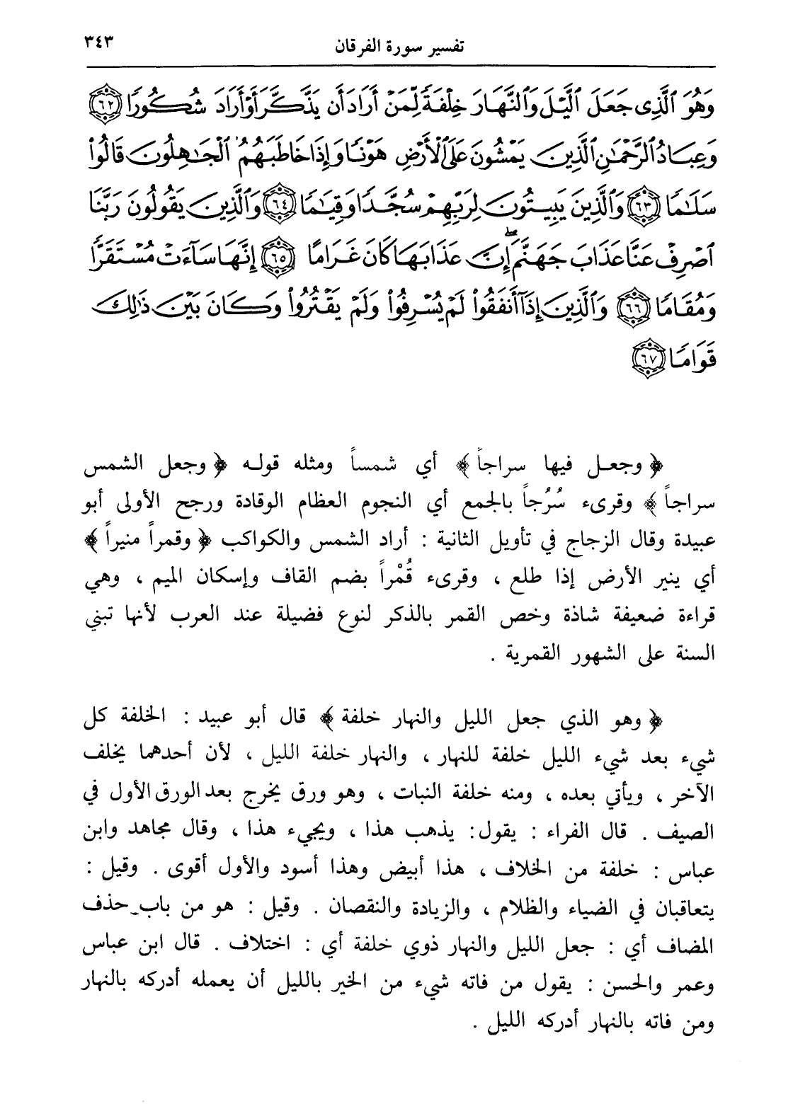 وَهُوَ الَّذِي جَعَلَ اللَّيْلَ وَالنَّهَارَ خِلْفَةً لِمَنْ أَرَادَ أَنْ يَذَّكَّرَ أَوْ أَرَادَ شُكُورًا (62) وَعِبَادُ الرَّحْمَنِ الَّذِينَ يَمْشُونَ عَلَى الْأَرْضِ هَوْنًا وَإِذَا خَاطَبَهُمُ الْجَاهِلُونَ قَالُوا سَلَامًا (63) وَالَّذِينَ يَبِيتُونَ لِرَبِّهِمْ سُجَّدًا وَقِيَامًا (64) وَالَّذِينَ يَقُولُونَ رَبَّنَا اصْرِفْ عَنَّا عَذَابَ جَهَنَّمَ إِنَّ عَذَابَهَا كَانَ غَرَامًا (65) إِنَّهَا سَاءَتْ مُسْتَقَرًّا وَمُقَامًا (66) وَالَّذِينَ إِذَا أَنْفَقُوا لَمْ يُسْرِفُوا وَلَمْ يَقْتُرُوا وَكَانَ بَيْنَ ذَلِكَ قَوَامًا (67)