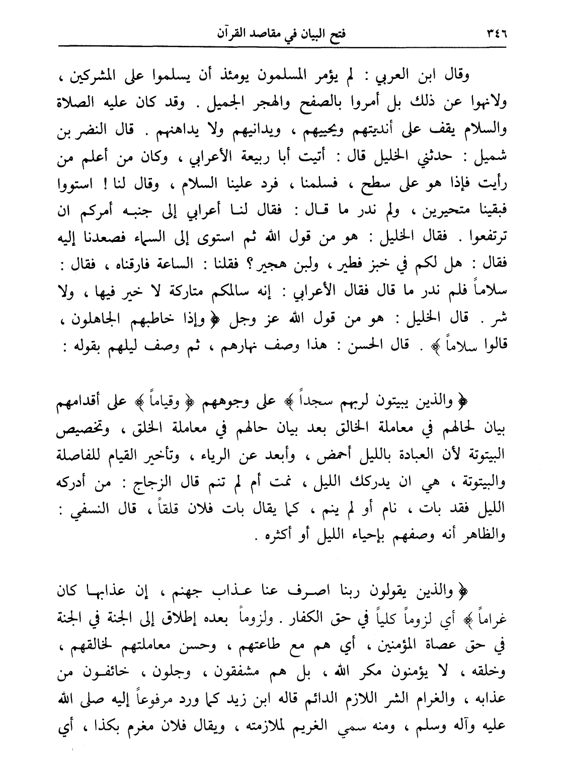 وقال ابن العربي: لم يؤمر المسلمون يومئذ أن يسلموا على المشركين، ولا نهوا عن ذلك بل أمروا بالصفح والهجر الجميل. وقد كان عليه الصلاة والسلام يقف على أنديتهم ويحييهم، ويدانيهم ولا يداهنهم. قال النضر بن شميل: حدثني الخليل قال: أتيت أبا ربيعة الأعرابي، وكان من أعلم من رأيت فإذا هو على سطح، فسلمنا، فرد علينا السلام، وقال لنا! استووا فبقينا متحيرين، ولم ندر ما قال: فقال لنا أعرابي إلى جنبه أمركم أن ترتفعوا. فقال الخليل: هو من قول الله ثم استوى إلى السماء فصعدنا إليه فقال: هل لكم في خبز فطير، ولبن هجير؟ فقلنا: الساعة فارقناه، فقال: سلاماً فلم ندر ما قال فقال الأعرابي: إنه سألكم متاركة لا خير فيها، ولا شر. قال الخليل: هو من قول الله عز وجل (وإذا خاطبهم الجاهلون، قالوا سلاماً). قال الحسن: هذا وصف نهارهم، ثم وصف ليلهم بقوله: