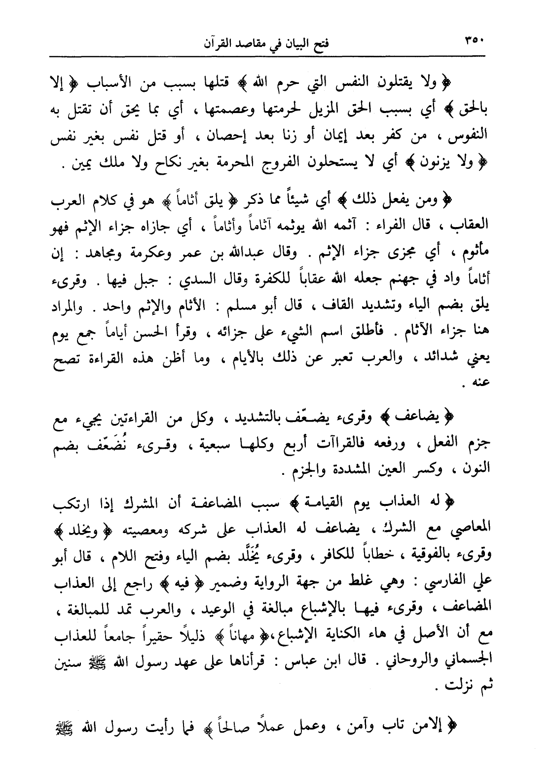 (ولا يقتلون النفس التي حرم الله) قتلها بسبب من الأسباب (إلا بالحق) أي بسبب الحق المزيل لحرمتها وعصمتها، أي بما يحق أن تقتل به النفوس، من كفر بعد إيمان أو زنا بعد إحصان، أو قتل نفس بغير نفس (ولا يزنون) أي لا يستحلون الفروج المحرمة بغير نكاح ولا ملك يمين.