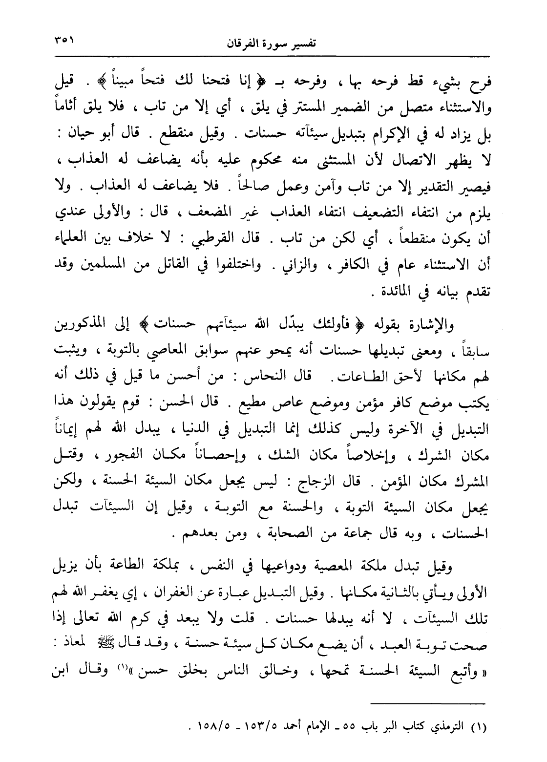 فرح بشيء قط فرحه بها، وفرحه بـ (إنا فتحنا لك فتحاً مبيناً). قيل والاستثناء متصل من الضمير المستتر في يلق، أي إلا من تاب، فلا يلق أثاماً بل يزاد له في الإكرام بتبديل سيئاته حسنات. وقيل منقطع. قال أبو حيان: لا يظهر الاتصال لأن المستثنى منه محكوم عليه بأنه يضاعف له العذاب، فيصير التقدير إلا من تاب وآمن وعمل صالحاً. فلا يضاعف له العذاب. ولا يلزم من انتفاء التضعيف انتفاء العذاب غير المضعف، قال: والأولى عندي أن يكون منقطعاً، أي لكن من تاب. قال القرطبي: لا خلاف بين العلماء أن الاستثناء عام في الكافر، والزاني. واختلفوا في القاتل من المسلمين وقد تقدم بيانه في المائدة.