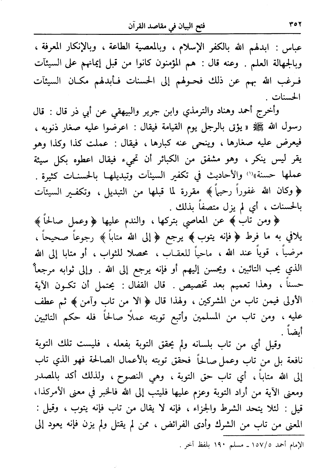 عباس: أبدلهم الله بالكفر الإسلام، وبالمعصية الطاعة، وبالإنكار المعرفة، وبالجهالة العلم. وعنه قال: هم المؤمنون كانوا من قبل إيمانهم على السيئات فرغب الله بهم عن ذلك فحولهم إلى الحسنات فأبدلهم مكان السيئات الحسنات.