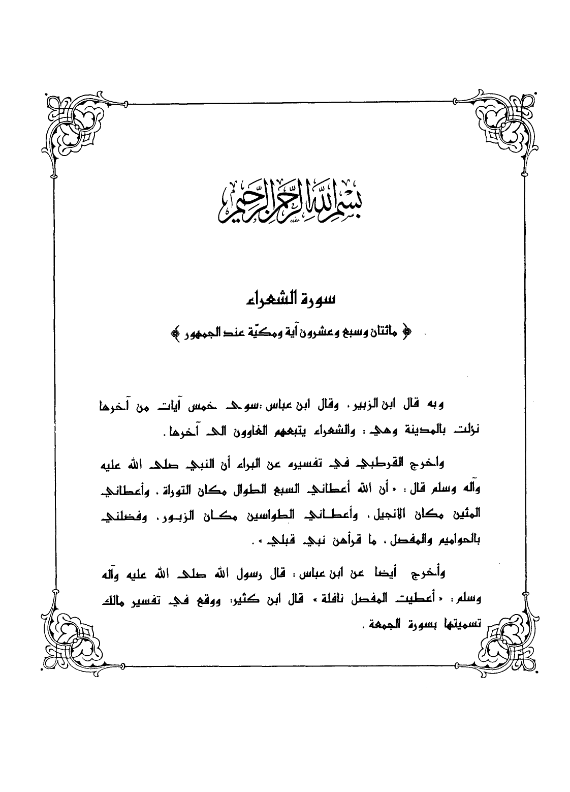(مائتان وسبع وعشرون آية ومكيّة عند الجمهور) وبه قال ابن الزبير، وقال ابن عباس: سوى خمس آيات من آخرها نزلت بالمدينة وهي: والشعراء يتبعهم الغاوون إلى آخرها.