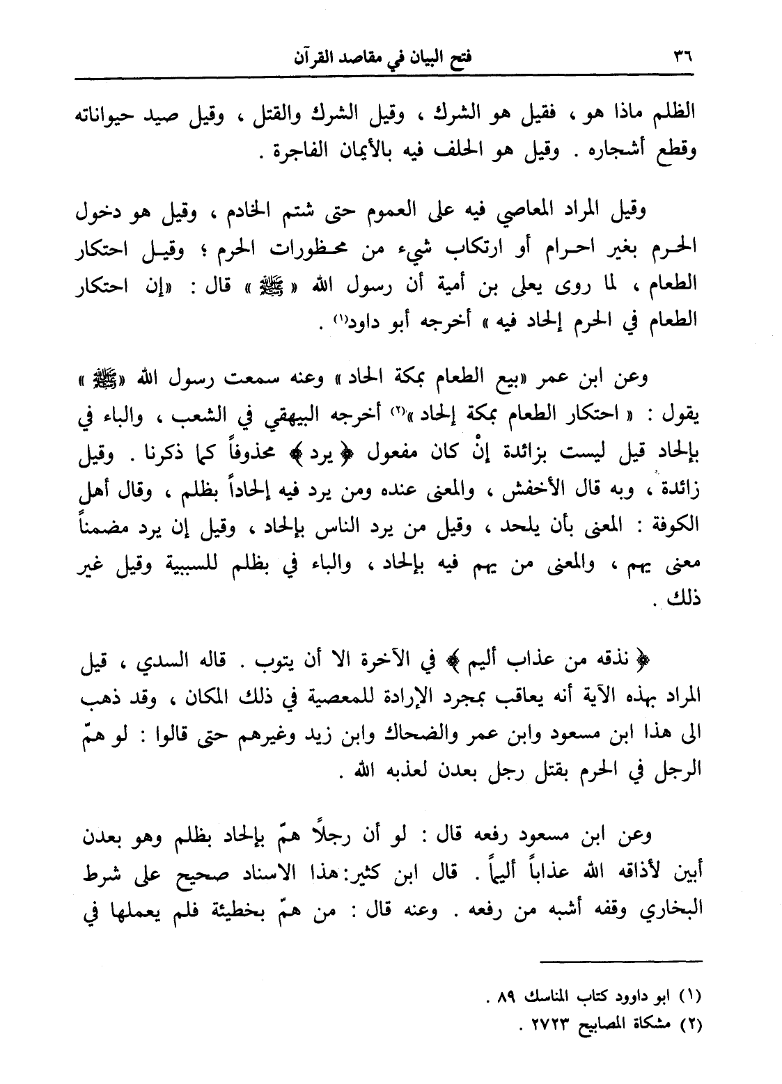 وقيل المراد المعاصي فيه على العموم حتى شتم الخادم، وقيل هو دخول الحرم بغير احرام أو ارتكاب شيء من محظورات الحرم؛ وقيل احتكار الطعام، لما روى يعلى بن أمية أن رسول الله " - صلى الله عليه وسلم - " قال: " إن احتكار الطعام في الحرم إلحاد فيه " أخرجه أبو داود (¬1).