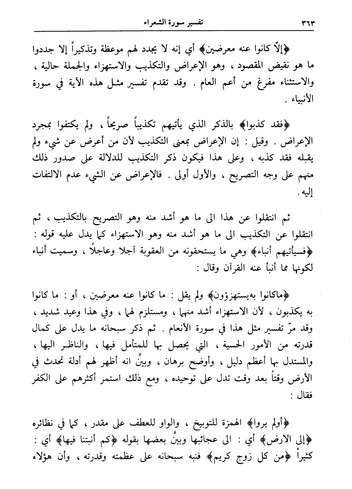 ثم انتقلوا عن هذا إلا ما هو أشد منه وهو التصريح بالتكذيب، ثم انتقلوا عن التكذيب إلى ما هو أشد منه وهو الاستهزاء كما يدل عليه قوله: (فسيأتيهم أنباء) وهي ما يستحقونه من العقوبة آجلاً وعاجلاً، وسميت أنباء لكونها مما أنبأ عنه القرآن وقال: