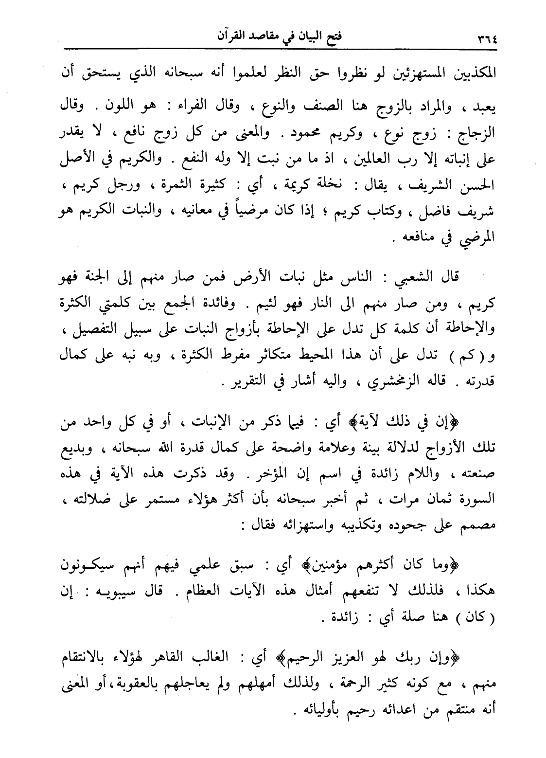 قال الشعبي: الناس مثل نبات الأرض فمن صار منهم إلى الجنة فهو كريم، ومن صار منهم إلى النار فهو لئيم. وفائدة الجمع بين كلمتي الكثرة والإحاطة أن كلمة كل تدل على الإحاطة بأزواج النبات على سبيل التفصيل، و (كم) تدل على أن هذا المحيط متكاثر مفرط الكثرة، وبه نبه على كمال قدرته. قاله الزمخشري، وإليه أشار في التقرير.