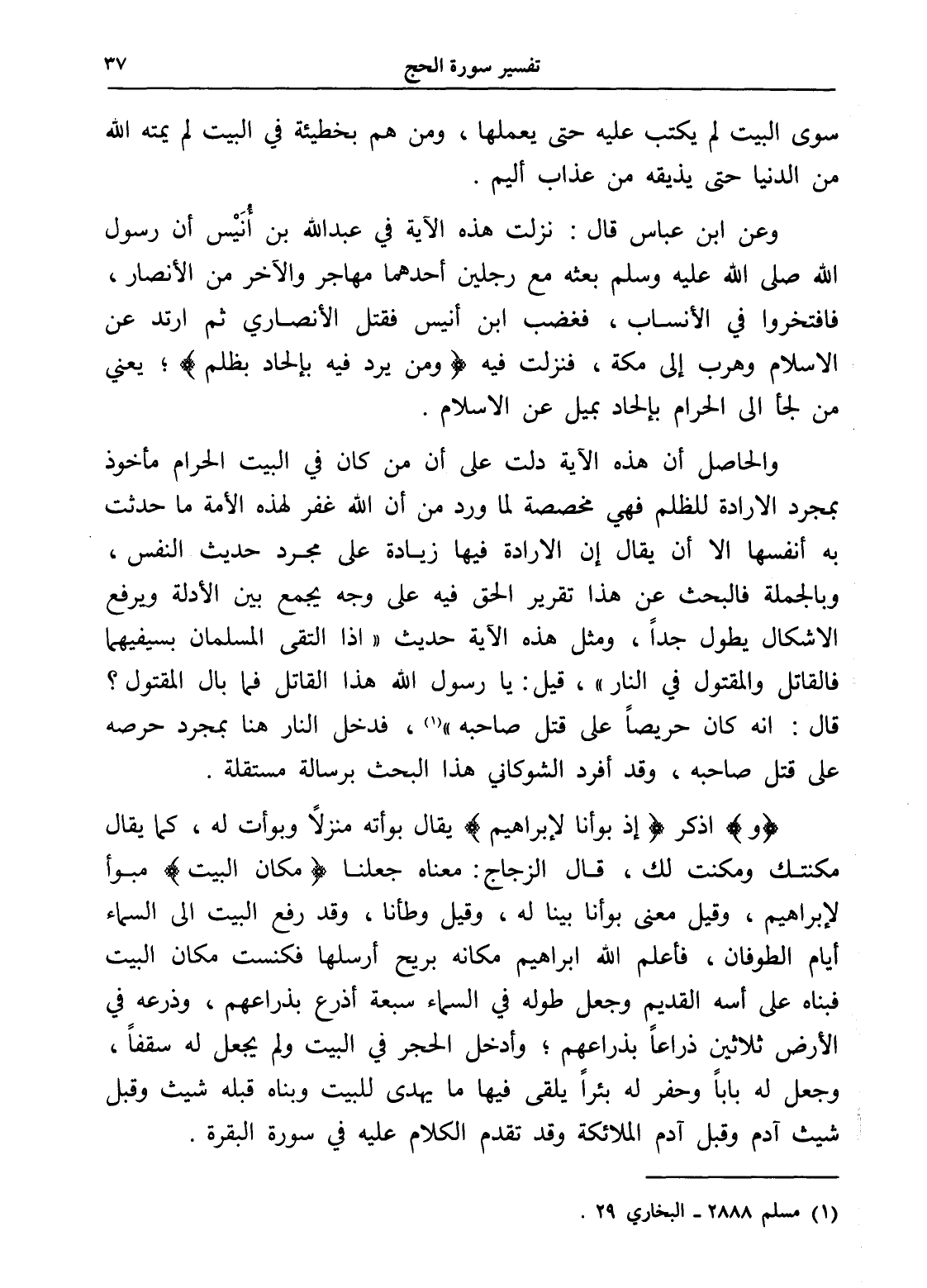 والحاصل أن هذه الآية دلت على أن من كان في البيت الحرام مأخوذ بمجرد الإرادة للظلم فهي مخصصة لما ورد من أن الله غفر لهذه الأمة ما حدثت به أنفسها إلا أن يقال إن الإرادة فيها زيادة على مجرد حديث النفس، وبالجملة فالبحث عن هذا تقرير الحق فيه على وجه يجمع بين الأدلة ويرفع الإشكال يطول جداً، ومثل هذه الآية حديث " إذا التقى المسلمان بسيفيهما فالقاتل والمقتول في النار "، قيل: يا رسول الله هذا القاتل فما بال المقتول؟ قال: " إنه كان حريصاً على قتل صاحبه " (¬1)، فدخل النار هنا بمجرد حرصه على قتل صاحبه، وقد أفرد الشوكاني هذا البحث برسالة مستقلة.