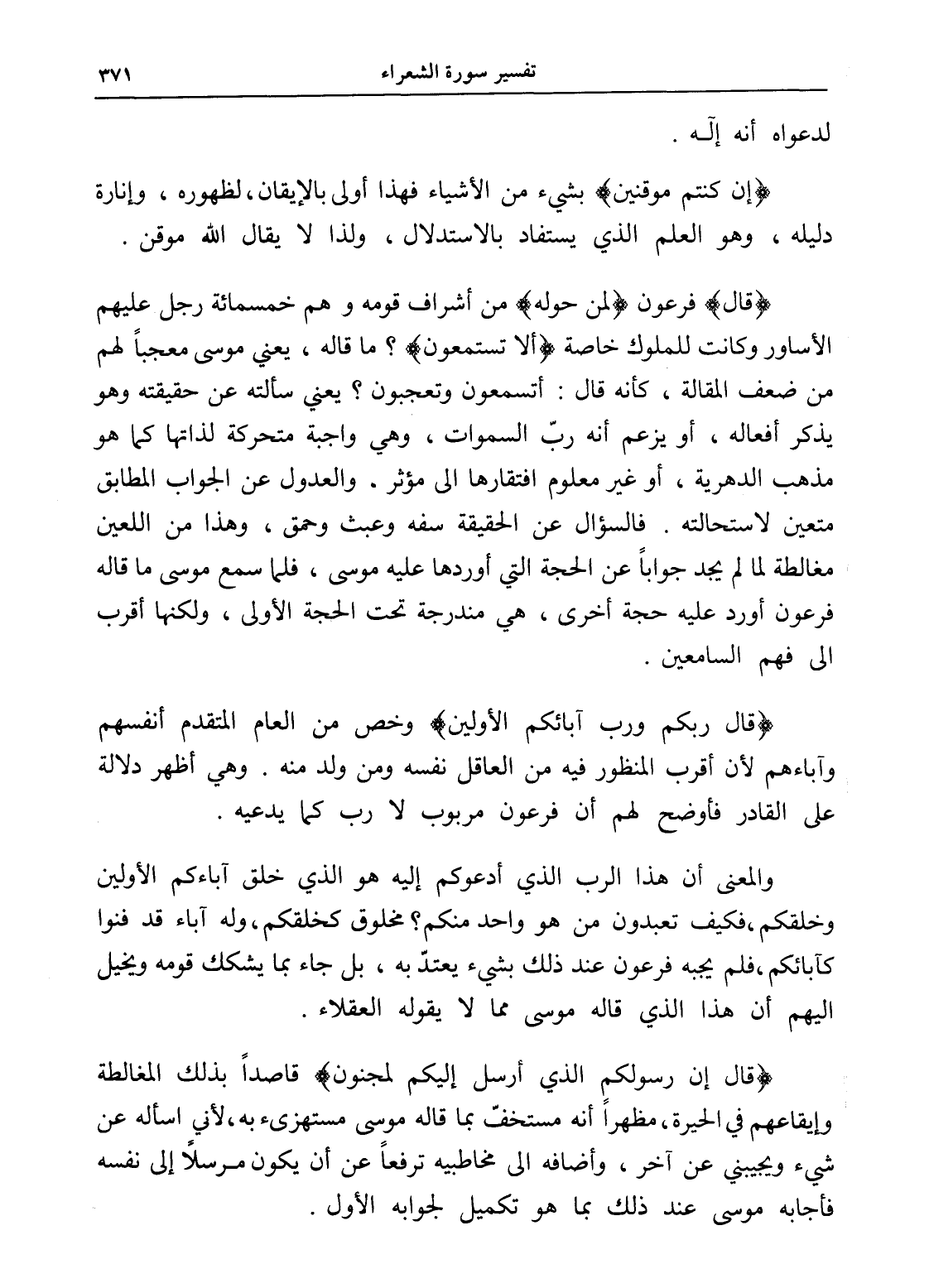 والمعنى أن هذا الرب الذي أدعوكم إليه هو الذي خلق آباءكم الأولين وخلقكم، فكيف تعبدون من هو واحد منكم؟ مخلوق كخلقكم، وله آباء قد فنوا كآبائكم، فلم يجبه فرعون عند ذلك بشيء يعتدّ به، بل جاء بما يشكك قومه ويخيل إليهم أن هذا الذي قاله موسى مما لا يقوله العقلاء.