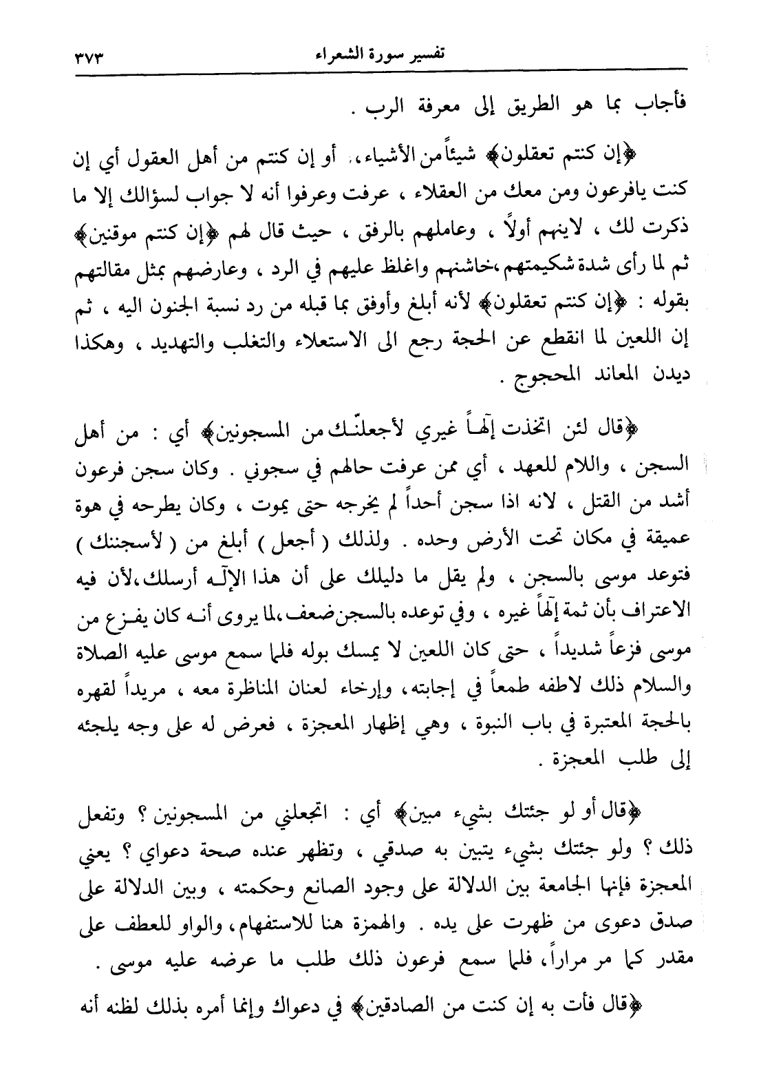(قال لئن اتخذت إلهاً غيري لأجعلنّك من المسجونين) أي: من أهل السجن، واللام للعهد، أي ممن عرفت حالهم في سجوني. وكان سجن فرعون أشد من القتل، لأنه إذا سجن أحداً لم يخرجه حتى يموت، وكان يطرحه في هوة عميقة في مكان تحت الأرض وحده. ولذلك (أجعل) أبلغ من (لأسجننك) فتوعد موسى بالسجن، ولم يقل ما دليلك على أن هذا الإله أرسلك، لأن فيه الاعتراف بأن ثمة إلهاً غيره، وفي توعده بالسجن ضعف، لما يروى أنه كان يفزع من موسى فزعاً شديداً، حتى كان اللعين لا يمسك بوله فلما سمع موسى عليه الصلاة والسلام ذلك لاطفه طمعاً في إجابته، وإرخاء لعنان المناظرة معه، مريداً لقهره بالحجة المعتبرة في باب النبوة، وهي إظهار المعجزة، فعرض له على وجه يلجئه إلى طلب المعجزة.