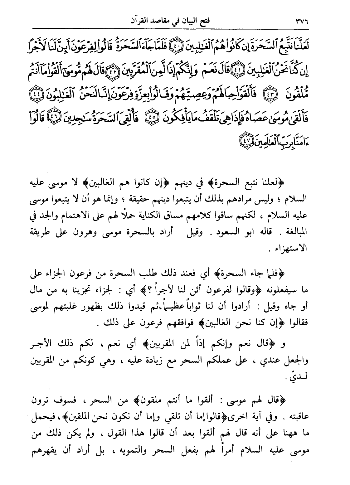 لَعَلَّنَا نَتَّبِعُ السَّحَرَةَ إِنْ كَانُوا هُمُ الْغَالِبِينَ (40) فَلَمَّا جَاءَ السَّحَرَةُ قَالُوا لِفِرْعَوْنَ أَئِنَّ لَنَا لَأَجْرًا إِنْ كُنَّا نَحْنُ الْغَالِبِينَ (41) قَالَ نَعَمْ وَإِنَّكُمْ إِذًا لَمِنَ الْمُقَرَّبِينَ (42) قَالَ لَهُمْ مُوسَى أَلْقُوا مَا أَنْتُمْ مُلْقُونَ (43) فَأَلْقَوْا حِبَالَهُمْ وَعِصِيَّهُمْ وَقَالُوا بِعِزَّةِ فِرْعَوْنَ إِنَّا لَنَحْنُ الْغَالِبُونَ (44) فَأَلْقَى مُوسَى عَصَاهُ فَإِذَا هِيَ تَلْقَفُ مَا يَأْفِكُونَ (45) فَأُلْقِيَ السَّحَرَةُ سَاجِدِينَ (46) قَالُوا آمَنَّا بِرَبِّ الْعَالَمِينَ (47)