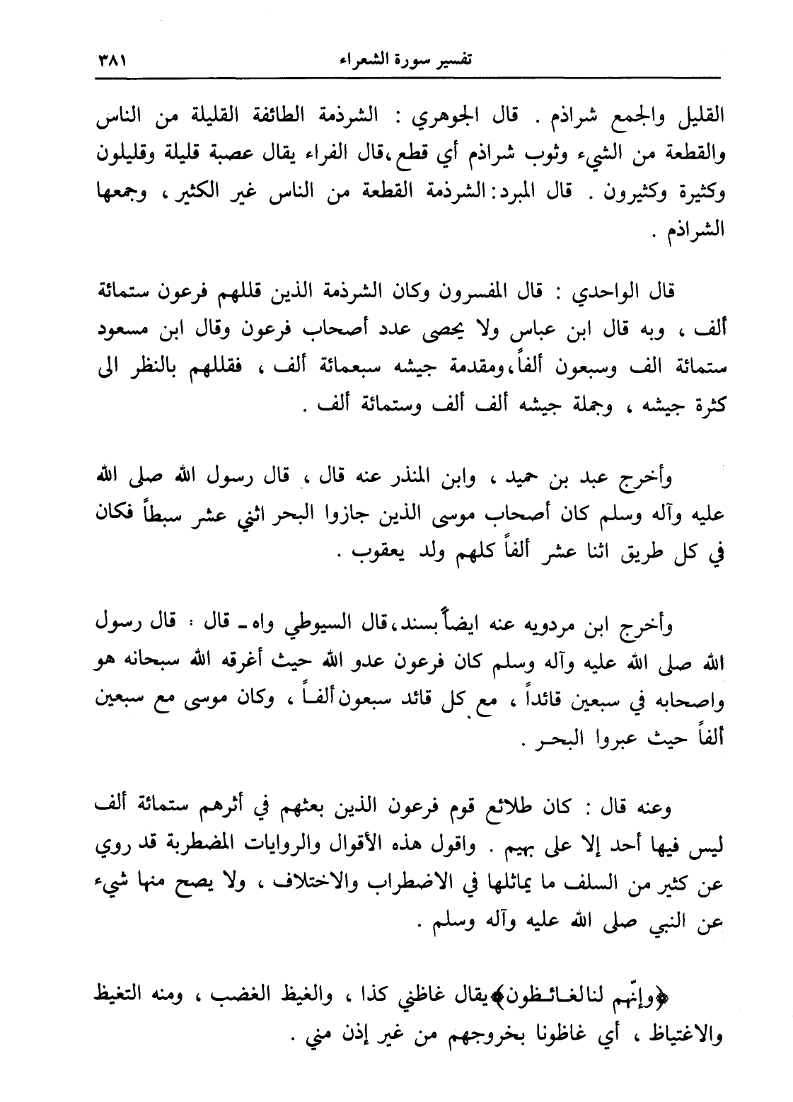 قال الواحدي: قال المفسرون وكان الشرذمة الذين قللهم فرعون ستمائة ألف، وبه قال ابن عباس ولا يحصى عدد أصحاب فرعون وقال ابن مسعود ستمائة ألف وسبعون ألفاً، ومقدمة جيشه سبعمائة ألف، فقللهم بالنظر إلى كثرة جيشه، وجملة جيشه ألف ألف وستمائة ألف.