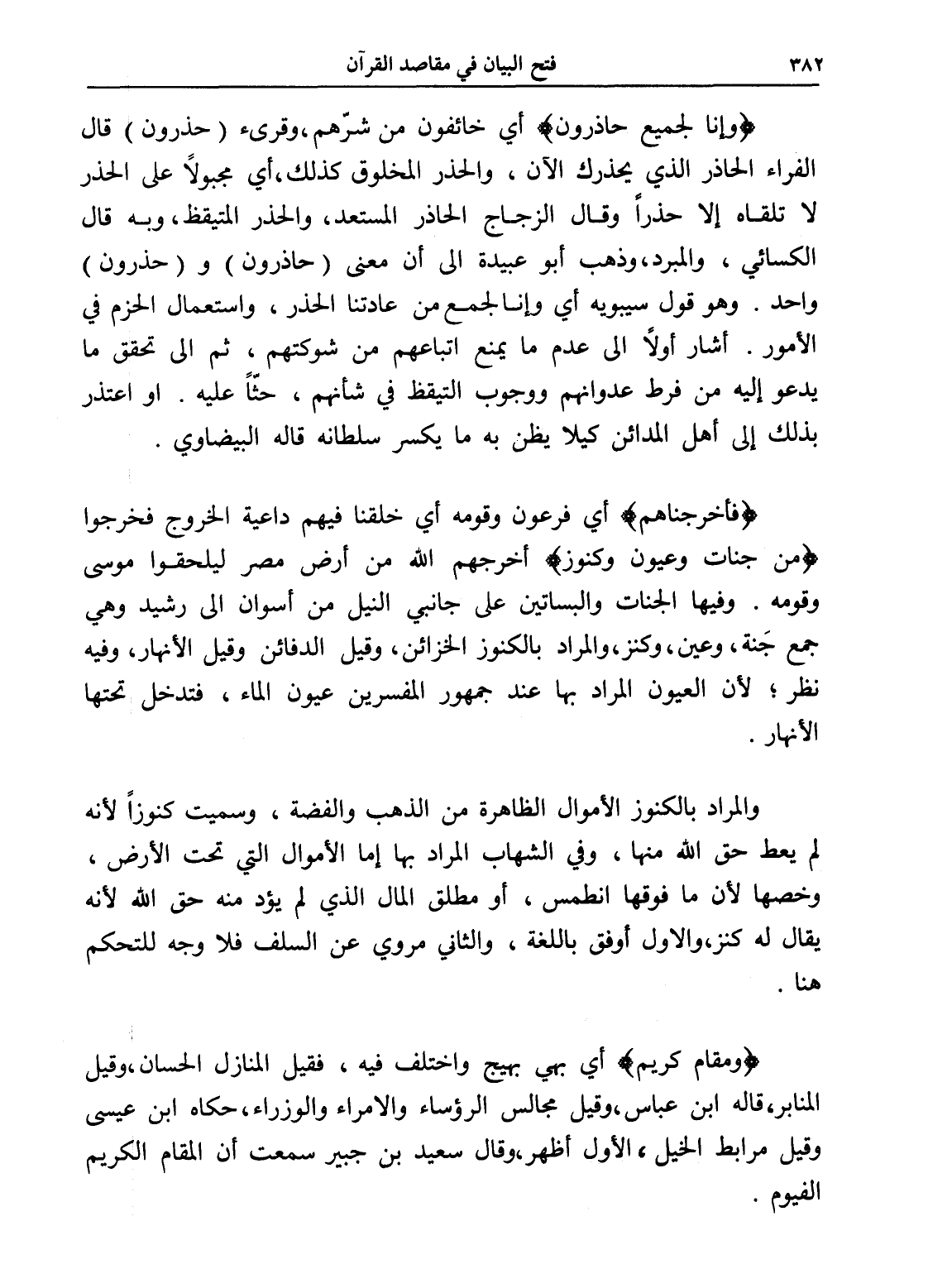 (فأخرجناهم) أي فرعون وقومه أي خلقنا فيهم داعية الخروج فخرجوا (من جنات وعيون وكنوز) أخرجهم الله من أرض مصر ليلحقوا موسى وقومه. وفيها الجنات والبساتين على جانبي النيل من أسوان إلى رشيد وهي جمع جَنة، وعين، وكنز، والمراد بالكنوز الخزائن، وقيل الدفائن وقيل الأنهار، وفيه نظر؛ لأن العيون المراد بها عند جمهور المفسرين عيون الماء، فتدخل تحتها الأنهار.