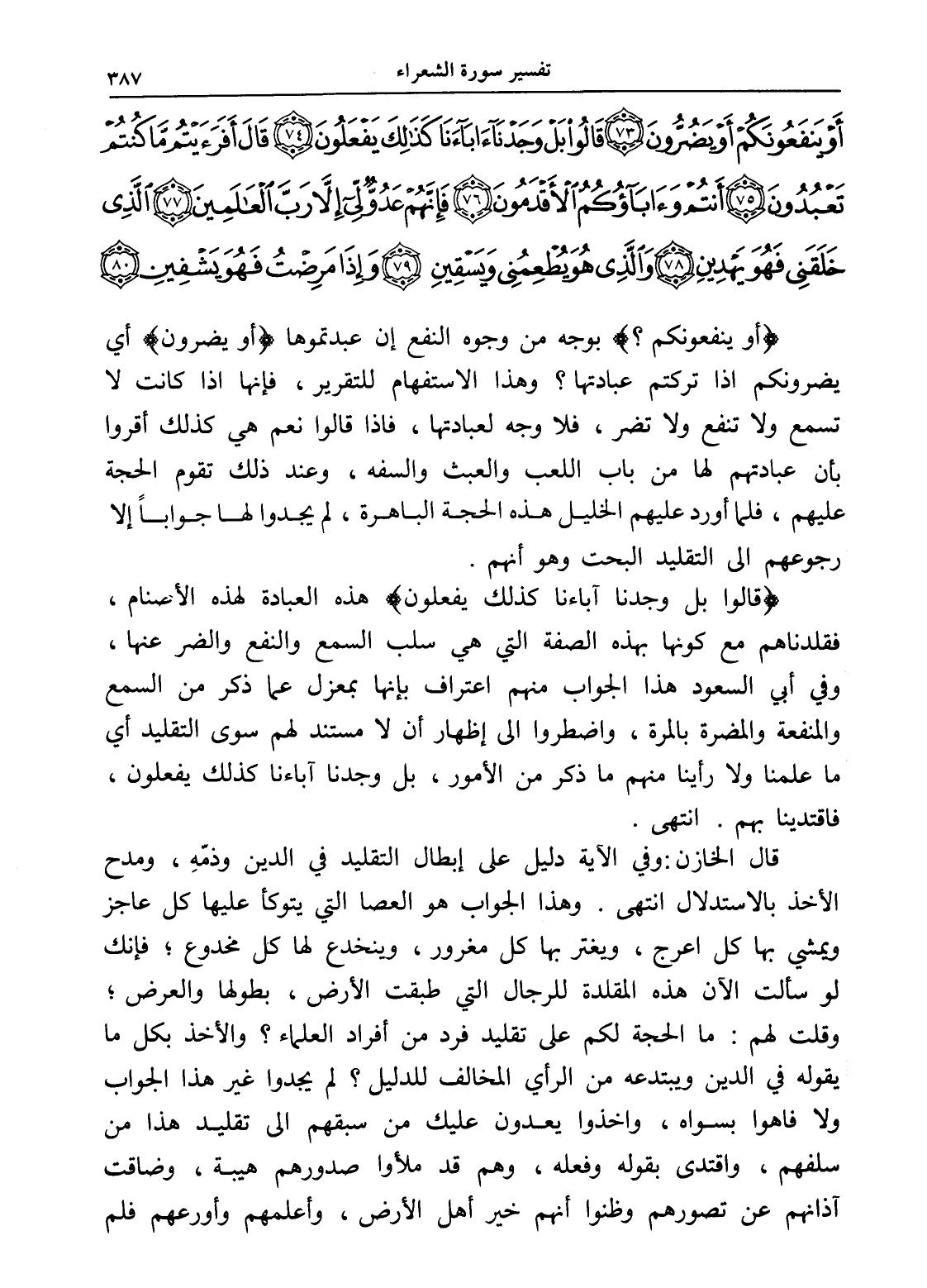 أَوْ يَنْفَعُونَكُمْ أَوْ يَضُرُّونَ (73) قَالُوا بَلْ وَجَدْنَا آبَاءَنَا كَذَلِكَ يَفْعَلُونَ (74) قَالَ أَفَرَأَيْتُمْ مَا كُنْتُمْ تَعْبُدُونَ (75) أَنْتُمْ وَآبَاؤُكُمُ الْأَقْدَمُونَ (76) فَإِنَّهُمْ عَدُوٌّ لِي إِلَّا رَبَّ الْعَالَمِينَ (77) الَّذِي خَلَقَنِي فَهُوَ يَهْدِينِ (78) وَالَّذِي هُوَ يُطْعِمُنِي وَيَسْقِينِ (79) وَإِذَا مَرِضْتُ فَهُوَ يَشْفِينِ (80)