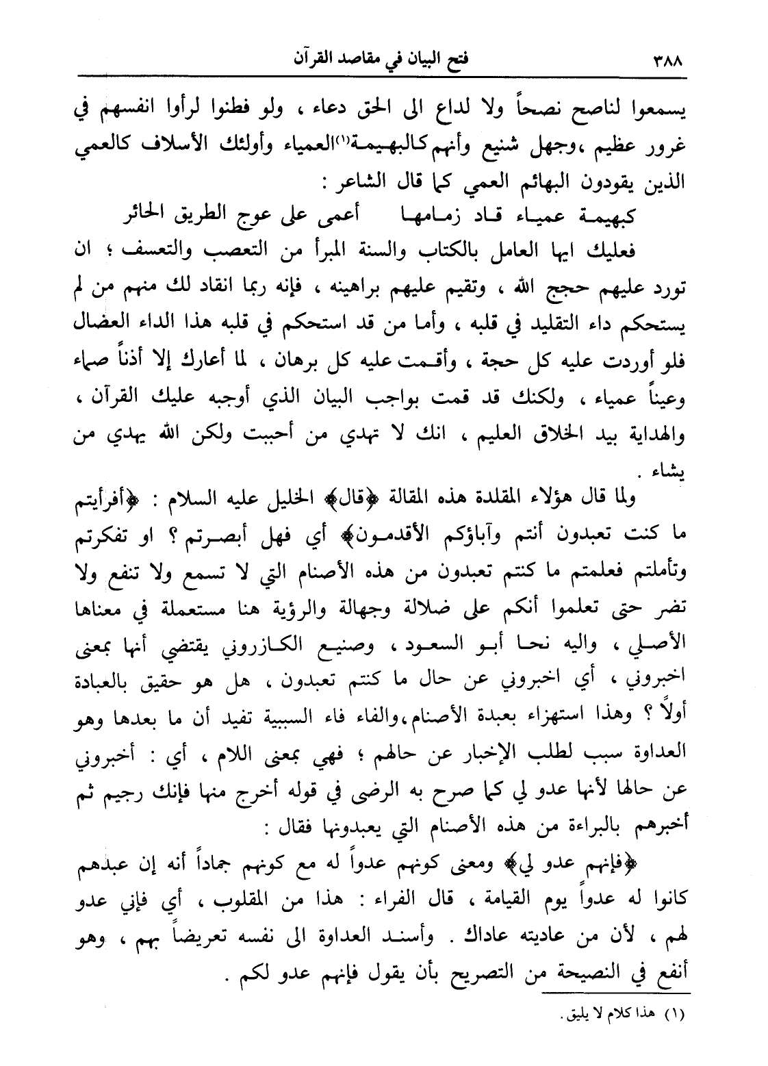 يسمعوا لناصح نصحاً ولا لداع إلى الحق دعاء، ولو فطنوا لرأوا أنفسهم في غرور عظيم، وجهل ثشيع وأنهم كالبهيمة (¬1) العمياء وأولئك الأسلاف كالعمي الذين يقودون البهائم العمي كما قال الشاعر:
