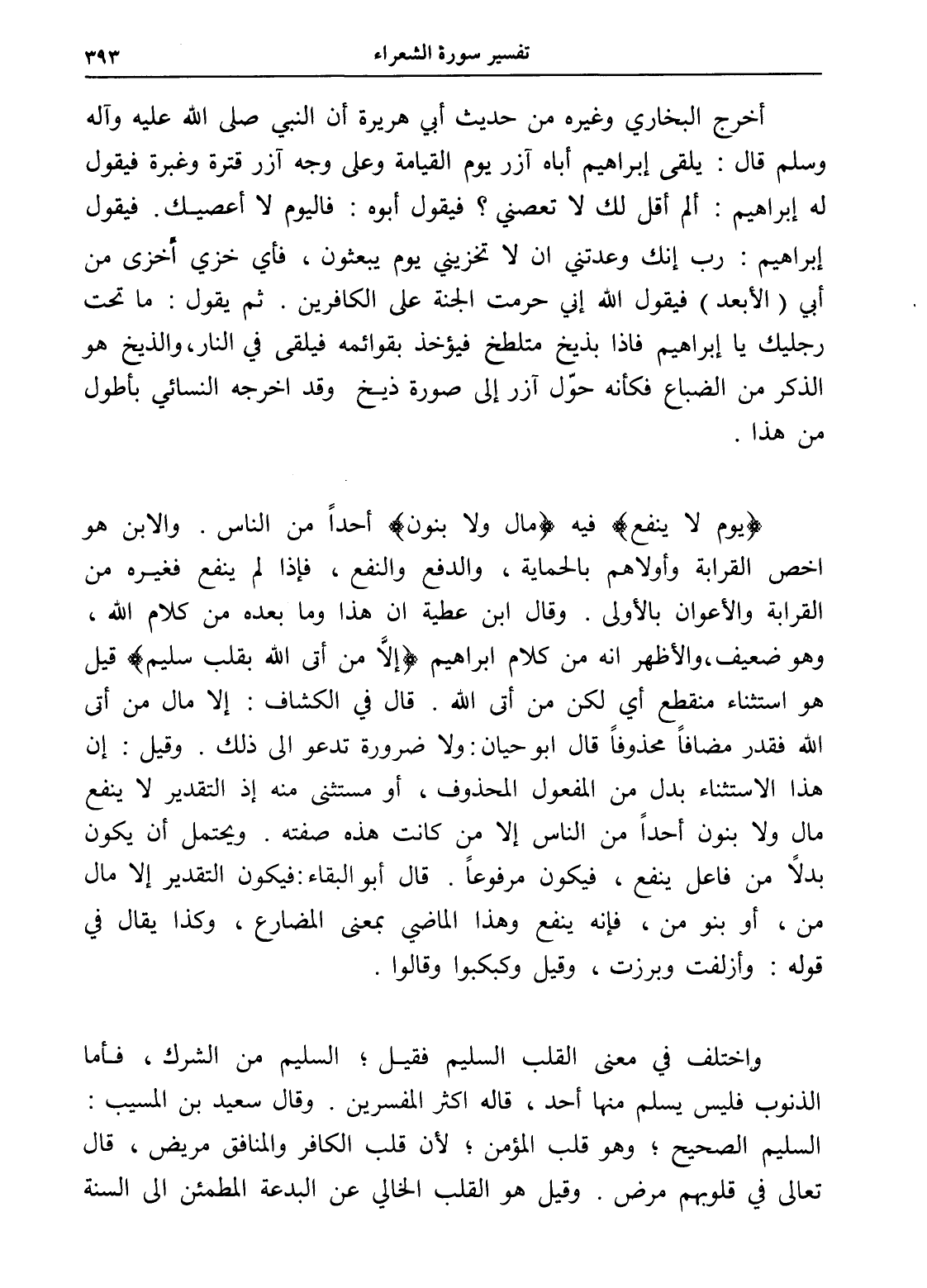 (يوم لا ينفع) فيه (مال ولا بنون) أحداً من الناس. والابن هو اخص القرابة وأولاهم بالحماية، والدفع والنفع، فإذا لم ينفع فغيره من القرابة والأعوان بالأولى. وقال ابن عطية إن هذا وما بعده من كلام الله، وهو ضعيف، والأظهر أنه من كلام إبراهيم