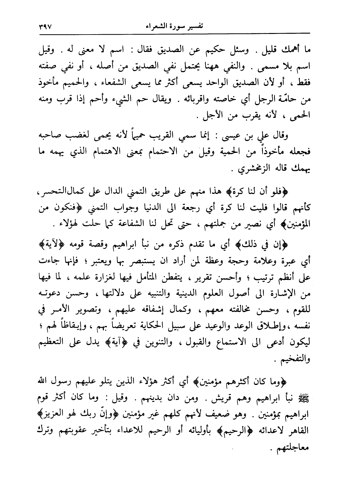 ما أهمك قليل. وسئل حكيم عن الصديق فقال: اسم لا معنى له. وقيل اسم بلا مسمى. والنفي هاهنا يحتمل نفي الصديق من أصله، أو نفي صفته فقط، أو لأن الصديق الواحد يسعى أكثر مما يسعى الشفعاء، والحميم مأخوذ من حامّة الرجل أي خاصته وأقربائه. ويقال حم الشيء وأحم إذا قرب ومنه الحمى، لأنه يقرب من الأجل.