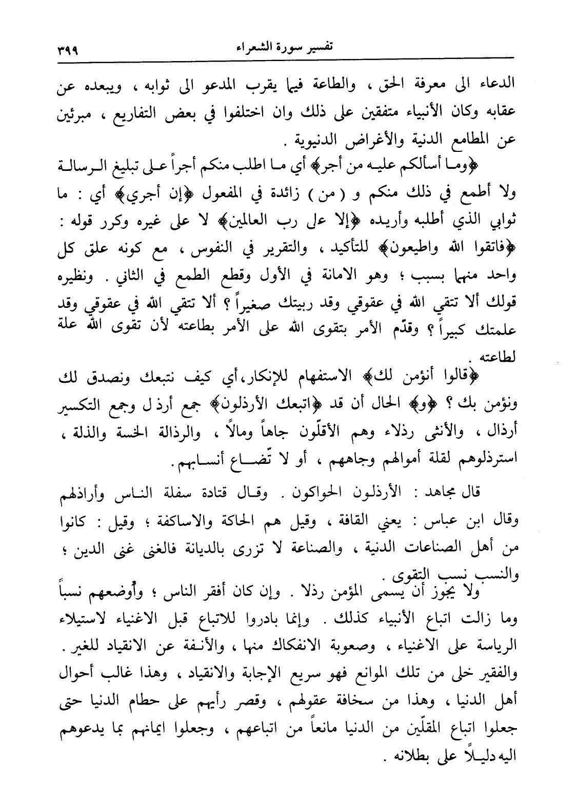 ولا يجوز أن يسمى المؤمن رذلا. وإن كان أفقر الناس؛ وأوضعهم نسباً وما زالت اتباع الأنبياء كذلك. وإنما بادروا للاتباع قبل الأغنياء لاستيلاء الرياسة على الأغنياء، وصعوبة الانفكاك منها، والأنفة عن الانقياد للغير. والفقير خلى من تلك الموانع فهو سريع الإجابة والانقياد، وهذا غالب أحوال أهل الدنيا، وهذا من سخافة عقولهم، وقصر رأيهم على حطام الدنيا حتى جعلوا اتباع المقلّين من الدنيا مانعاً من اتباعهم، وجعلوا إيمانهم بما يدعوهم إليه دليلاً على بطلانه.