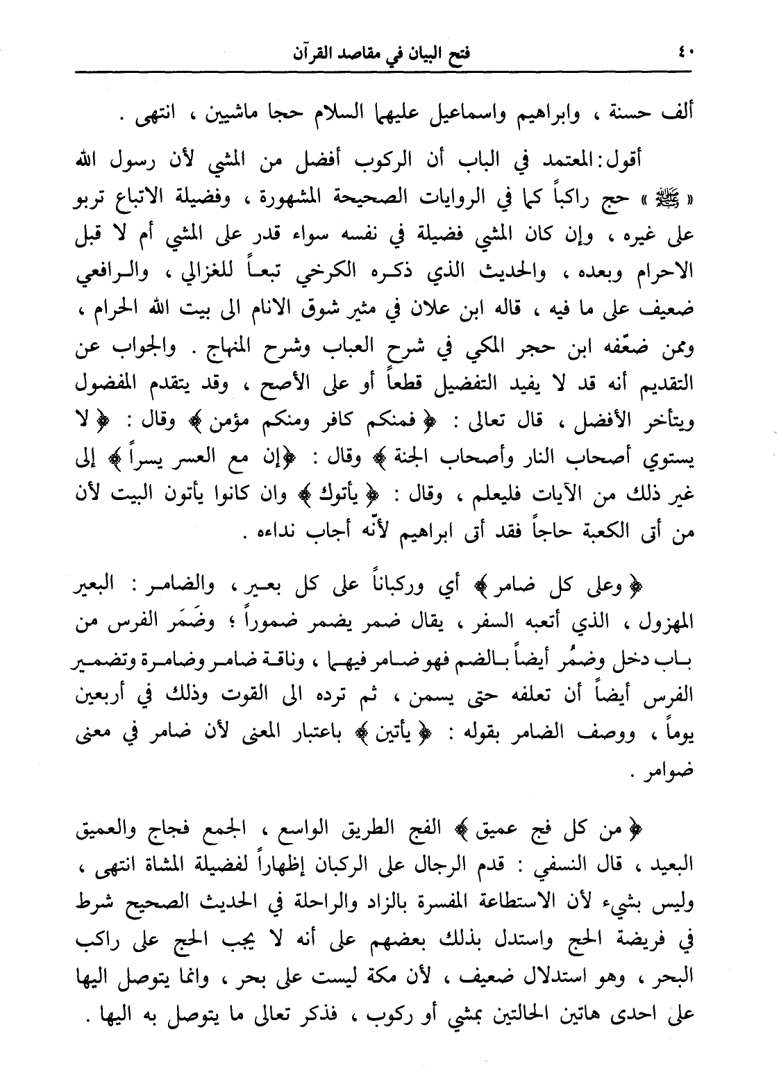 أقول: المعتمد في الباب أن الركوب أفضل من المشي لأن رسول الله " - صلى الله عليه وسلم - " حج راكباً كما في الروايات الصحيحة المشهورة، وفضيلة الاتباع تربو على غيره، وإن كان المشي فضيلة في نفسه سواء قدر على المشي أم لا قبل الإحرام وبعده، والحديث الذي ذكره الكرخي تبعاً للغزالي، والرافعي ضعيف على ما فيه، قاله ابن علان في مثير شوق الأنام إلى بيت الله الحرام، وممن ضعّفه ابن حجر المكي في شرح العباب وشرح المنهاج. والجواب عن التقديم أنه قد لا يفيد التفضيل قطعاً أو على الأصح، وقد يتقدم المفضول ويتأخر الأفضل، قال تعالى: (فمنكم كافر ومنكم مؤمن) وقال: (لا يستوي أصحاب النار وأصحاب الجنة) وقال: (إن مع العسر يسراً) إلى غير ذلك من الآيات فليعلم، وقال: (يأتوك) وإن كانوا يأتون البيت لأن من أتى الكعبة حاجاً فقد أتى إبراهيم لأنه أجاب نداءه.