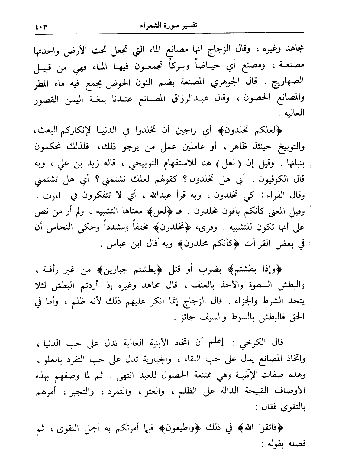 (لعلكم تخلدون) أي راجين أن تخلدوا في الدنيا لإنكاركم البعث، والتوبيخ حينئذ ظاهر، أو عاملين عمل من يرجو ذلك، فلذلك تحكمون بنيانها. وقيل إن (لعل) هنا للاستفهام التوبيخي، قاله زيد بن علي، وبه قال الكوفيون، أي هل تخلدون؟ كقولهم لعلك تشتمني؟ أي هل تشتمني وقال الفراء: كي تخلدون، وبه قرأ عبد الله، أي لا تتفكرون في الموت. وقيل المعنى كأنكم باقون مخلدون. فـ (لعل) معناها التشبيه، ولم أر من نص على أنها تكون للتشبيه. وقرئ (تخلدون) مخففاً ومشدداً وحكى النحاس أن في بعض القراءات (كأنكم مخلدون) وبه قال ابن عباس.