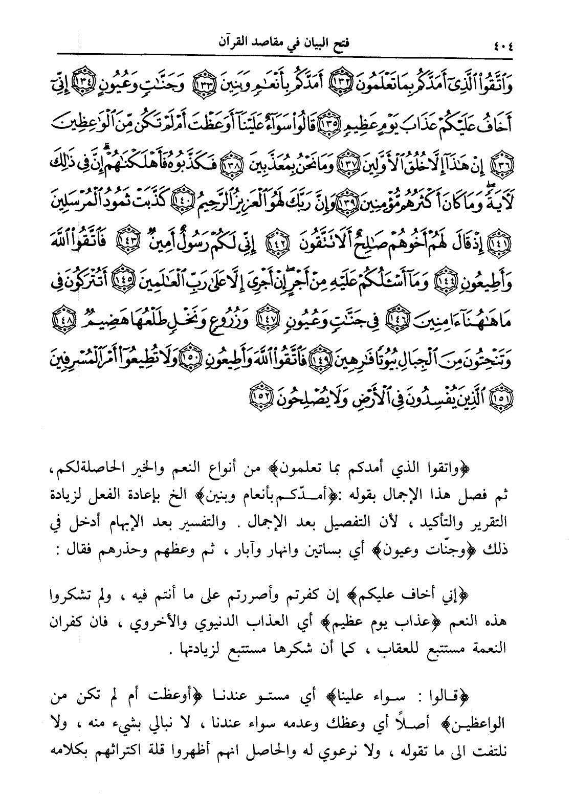 وَاتَّقُوا الَّذِي أَمَدَّكُمْ بِمَا تَعْلَمُونَ (132) أَمَدَّكُمْ بِأَنْعَامٍ وَبَنِينَ (133) وَجَنَّاتٍ وَعُيُونٍ (134) إِنِّي أَخَافُ عَلَيْكُمْ عَذَابَ يَوْمٍ عَظِيمٍ (135) قَالُوا سَوَاءٌ عَلَيْنَا أَوَعَظْتَ أَمْ لَمْ تَكُنْ مِنَ الْوَاعِظِينَ (136) إِنْ هَذَا إِلَّا خُلُقُ الْأَوَّلِينَ (137) وَمَا نَحْنُ بِمُعَذَّبِينَ (138) فَكَذَّبُوهُ فَأَهْلَكْنَاهُمْ إِنَّ فِي ذَلِكَ لَآيَةً وَمَا كَانَ أَكْثَرُهُمْ مُؤْمِنِينَ (139) وَإِنَّ رَبَّكَ لَهُوَ الْعَزِيزُ الرَّحِيمُ (140) كَذَّبَتْ ثَمُودُ الْمُرْسَلِينَ (141) إِذْ قَالَ لَهُمْ أَخُوهُمْ صَالِحٌ أَلَا تَتَّقُونَ (142) إِنِّي لَكُمْ رَسُولٌ أَمِينٌ (143) فَاتَّقُوا اللَّهَ وَأَطِيعُونِ (144) وَمَا أَسْأَلُكُمْ عَلَيْهِ مِنْ أَجْرٍ إِنْ أَجْرِيَ إِلَّا عَلَى رَبِّ الْعَالَمِينَ (145) أَتُتْرَكُونَ فِي مَا هَاهُنَا آمِنِينَ (146) فِي جَنَّاتٍ وَعُيُونٍ (147) وَزُرُوعٍ وَنَخْلٍ طَلْعُهَا هَضِيمٌ (148) وَتَنْحِتُونَ مِنَ الْجِبَالِ بُيُوتًا فَارِهِينَ (149) فَاتَّقُوا اللَّهَ وَأَطِيعُونِ (150) وَلَا تُطِيعُوا أَمْرَ الْمُسْرِفِينَ (151) الَّذِينَ يُفْسِدُونَ فِي الْأَرْضِ وَلَا يُصْلِحُونَ (152)
