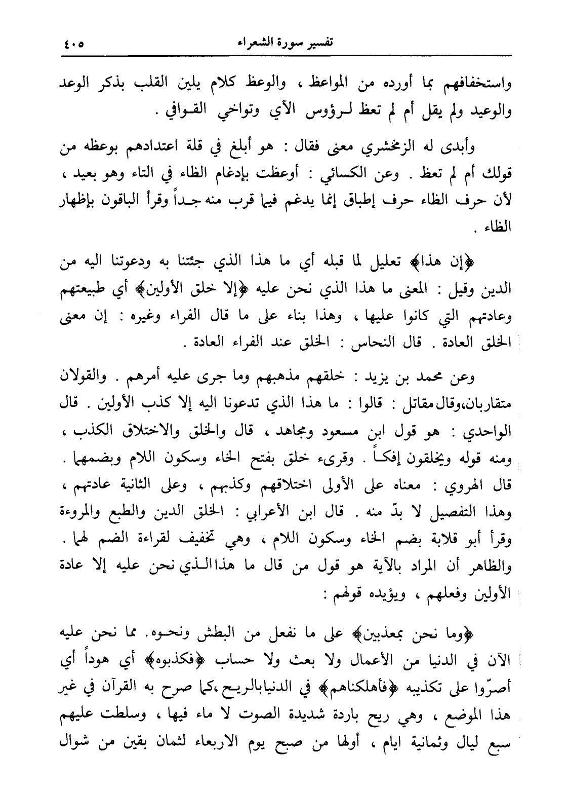 (إن هذا) تعليل لما قبله أي ما هذا الذي جئتنا به ودعوتنا إليه من الدين وقيل: المعنى ما هذا الذي نحن عليه (إلا خلق الأولين) أي طبيعتهم وعادتهم التي كانوا عليها، وهذا بناء على ما قال الفراء وغيره: إن معنى الخلق العادة. قال النحاس: الخلق عند الفراء العادة.