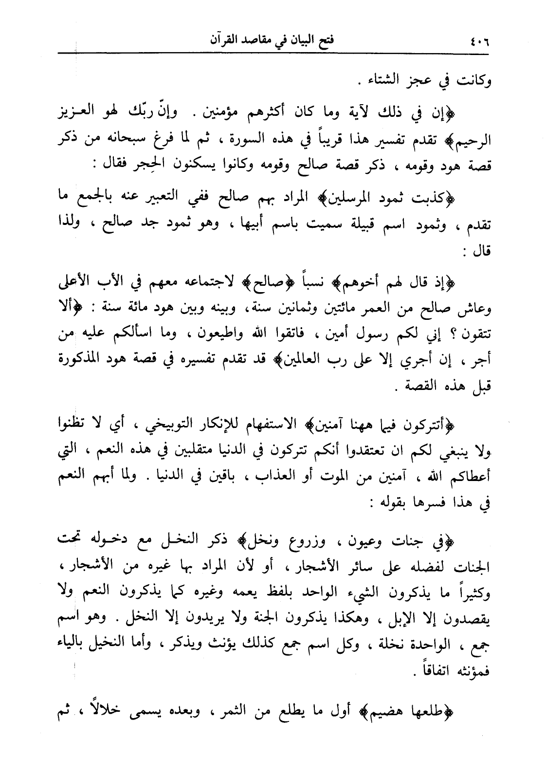 (فِي جَنَّاتٍ وَعُيُونٍ * وَزُرُوعٍ وَنَخْلٍ) ذكر النخل مع دخوله تحت الجنات لفضله على سائر الأشجار، أو لأن المراد بها غيره من الأشجار، وكثيراً ما يذكرون الشيء الواحد بلفظ يعمه وغيره كما يذكرون النعم ولا يقصدون إلا الإبل، وهكذا يذكرون الجنة ولا يريدون إلا النخل. وهو اسم جمع، الواحدة نخلة، وكل اسم جمع كذلك يؤنث ويذكر، وأما النخيل بالياء فمؤنثه اتفاقاً.