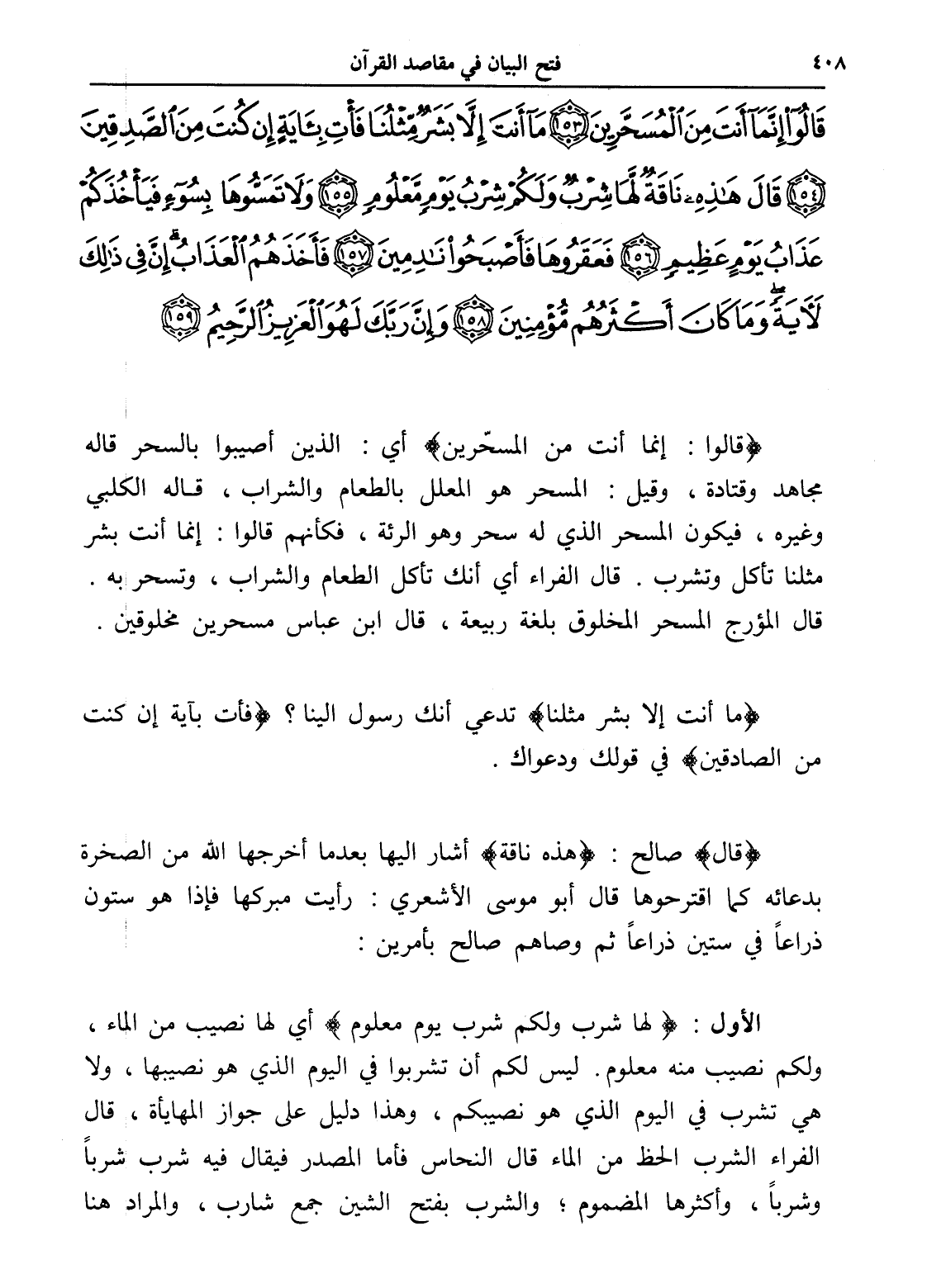 قَالُوا إِنَّمَا أَنْتَ مِنَ الْمُسَحَّرِينَ (153) مَا أَنْتَ إِلَّا بَشَرٌ مِثْلُنَا فَأْتِ بِآيَةٍ إِنْ كُنْتَ مِنَ الصَّادِقِينَ (154) قَالَ هَذِهِ نَاقَةٌ لَهَا شِرْبٌ وَلَكُمْ شِرْبُ يَوْمٍ مَعْلُومٍ (155) وَلَا تَمَسُّوهَا بِسُوءٍ فَيَأْخُذَكُمْ عَذَابُ يَوْمٍ عَظِيمٍ (156) فَعَقَرُوهَا فَأَصْبَحُوا نَادِمِينَ (157) فَأَخَذَهُمُ الْعَذَابُ إِنَّ فِي ذَلِكَ لَآيَةً وَمَا كَانَ أَكْثَرُهُمْ مُؤْمِنِينَ (158) وَإِنَّ رَبَّكَ لَهُوَ الْعَزِيزُ الرَّحِيمُ (159)