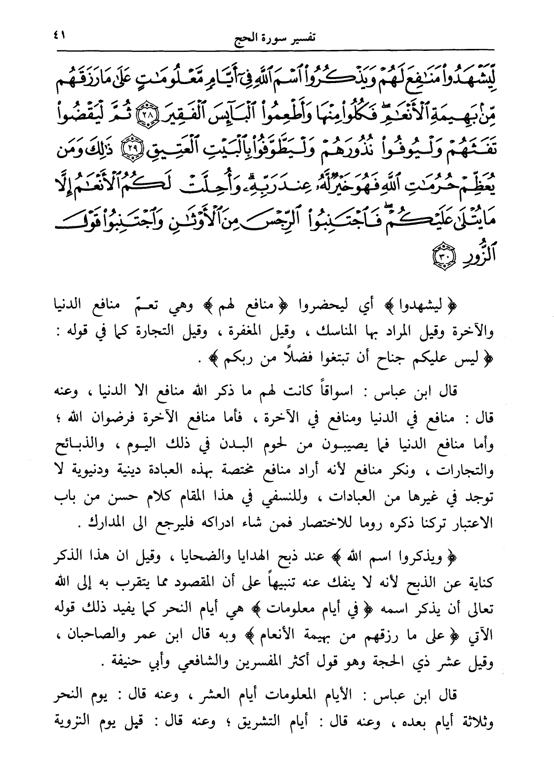 لِيَشْهَدُوا مَنَافِعَ لَهُمْ وَيَذْكُرُوا اسْمَ اللَّهِ فِي أَيَّامٍ مَعْلُومَاتٍ عَلَى مَا رَزَقَهُمْ مِنْ بَهِيمَةِ الْأَنْعَامِ فَكُلُوا مِنْهَا وَأَطْعِمُوا الْبَائِسَ الْفَقِيرَ (28) ثُمَّ لْيَقْضُوا تَفَثَهُمْ وَلْيُوفُوا نُذُورَهُمْ وَلْيَطَّوَّفُوا بِالْبَيْتِ الْعَتِيقِ (29) ذَلِكَ وَمَنْ يُعَظِّمْ حُرُمَاتِ اللَّهِ فَهُوَ خَيْرٌ لَهُ عِنْدَ رَبِّهِ وَأُحِلَّتْ لَكُمُ الْأَنْعَامُ إِلَّا مَا يُتْلَى عَلَيْكُمْ فَاجْتَنِبُوا الرِّجْسَ مِنَ الْأَوْثَانِ وَاجْتَنِبُوا قَوْلَ الزُّورِ (30)