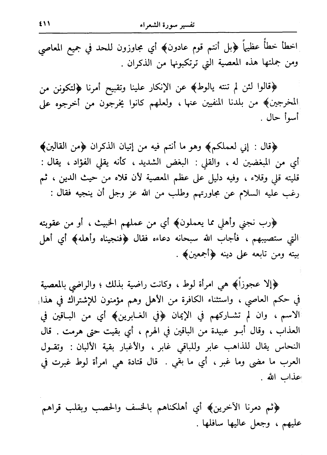 (قال إني لعملكم) وهو ما أنتم فيه من إتيان الذكران (من القالين) أي من المبغضين له، والقلي: البغض الشديد، كأنه يقلي الفؤاد، يقال: قليته قلي وقلاء، وفيه دليل على عظم المعصية لأن قلاه من حيث الدين، ثم رغب عليه السلام عن مجاورتهم وطلب من الله عز وجل أن ينجيه فقال: