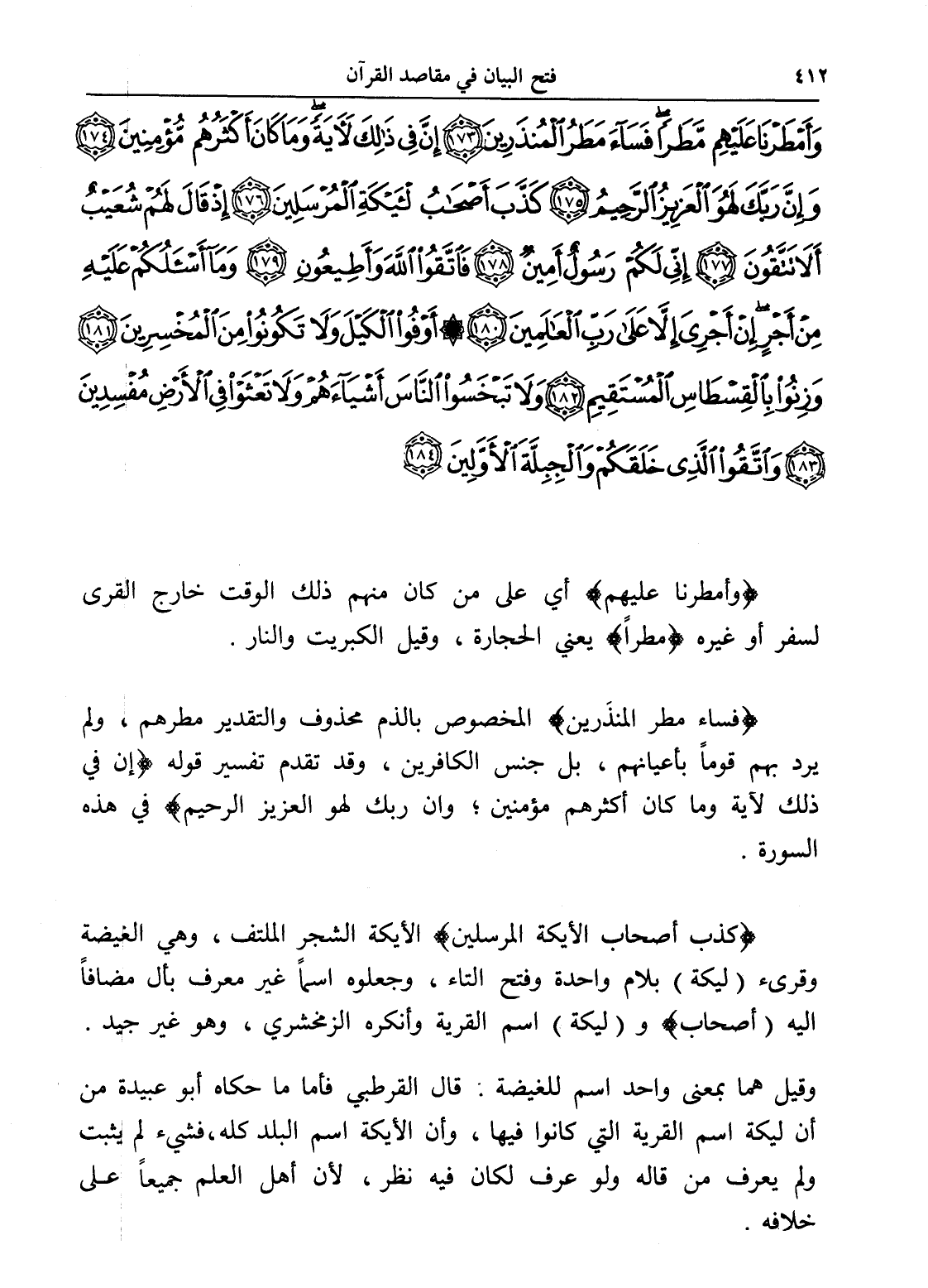 وَأَمْطَرْنَا عَلَيْهِمْ مَطَرًا فَسَاءَ مَطَرُ الْمُنْذَرِينَ (173) إِنَّ فِي ذَلِكَ لَآيَةً وَمَا كَانَ أَكْثَرُهُمْ مُؤْمِنِينَ (174) وَإِنَّ رَبَّكَ لَهُوَ الْعَزِيزُ الرَّحِيمُ (175) كَذَّبَ أَصْحَابُ الْأَيْكَةِ الْمُرْسَلِينَ (176) إِذْ قَالَ لَهُمْ شُعَيْبٌ أَلَا تَتَّقُونَ (177) إِنِّي لَكُمْ رَسُولٌ أَمِينٌ (178) فَاتَّقُوا اللَّهَ وَأَطِيعُونِ (179) وَمَا أَسْأَلُكُمْ عَلَيْهِ مِنْ أَجْرٍ إِنْ أَجْرِيَ إِلَّا عَلَى رَبِّ الْعَالَمِينَ (180) أَوْفُوا الْكَيْلَ وَلَا تَكُونُوا مِنَ الْمُخْسِرِينَ (181) وَزِنُوا بِالْقِسْطَاسِ الْمُسْتَقِيمِ (182) وَلَا تَبْخَسُوا النَّاسَ أَشْيَاءَهُمْ وَلَا تَعْثَوْا فِي الْأَرْضِ مُفْسِدِينَ (183) وَاتَّقُوا الَّذِي خَلَقَكُمْ وَالْجِبِلَّةَ الْأَوَّلِينَ (184)
