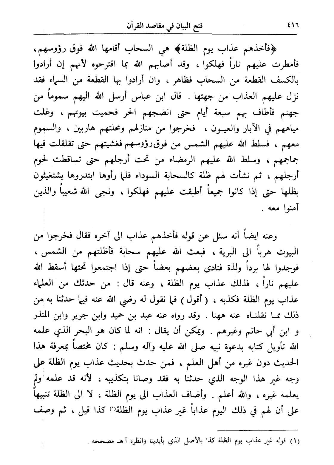 وعنه أيضاً أنه سئل عن قوله فأخذهم عذاب إلى آخره فقال فخرجوا من البيوت هرباً إلى البرية، فبعث الله عليهم سحابة فأظلتهم من الشمس، فوجدوا لها برداً ولذة فنادى بعضهم بعضاً حتى إذا اجتمعوا تحتها أسقط الله عليهم ناراً، فذلك عذاب يوم الظلة، وعنه قال: من حدثك من العلماء عذاب يوم الظلة فكذبه، (أقول) فما نقول له رضي الله عنه فيما حدثنا به من ذلك مما نقلناه عنه هاهنا. وقد رواه عنه عبد بن حميد وابن جرير وابن المنذر وابن أبي حاتم وغيرهم. ويمكن أن يقال: أنه لما كان هو البحر الذي علمه الله تأويل كتابه بدعوة نبيه صلى الله عليه وآله وسلم: كان مختصاً بمعرفة هذا الحديث دون غيره من أهل العلم، فمن حدث بحديث عذاب يوم الظلة على وجه غير هذا الوجه الذي حدثنا به فقد وصانا بتكذيبه، لأنه قد علمه ولم يعلمه غيره، والله أعلم. وأضاف العذاب إلى يوم الظلة، لا إلى الظلة تنبيهاً على أن لهم في ذلك اليوم عذاباً غير عذاب يوم الظلة (¬1) كذا قيل، ثم وصف