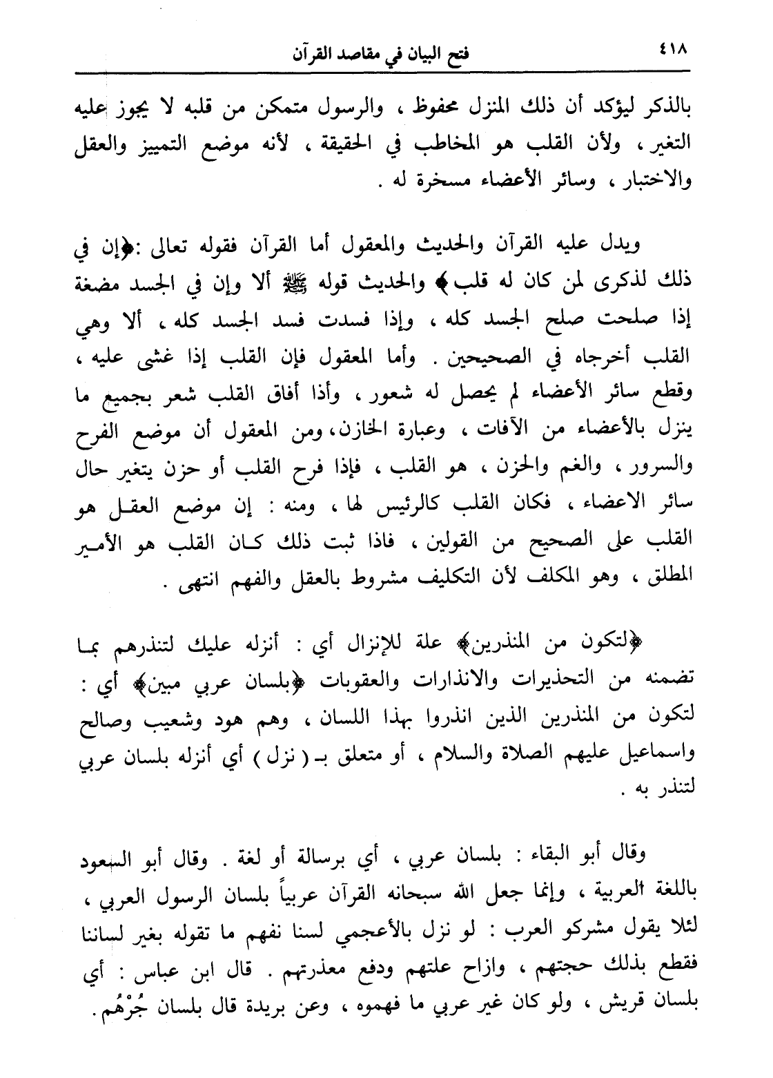 ويدل عليه القرآن والحديث والمعقول أما القرآن فقوله تعالى: (إن في ذلك لذكرى لمن كان له قلب) والحديث قوله - صلى الله عليه وسلم - ألا وإن في الجسد مضغة إذا صلحت صلح الجسد كله، وإذا فسدت فسد الجسد كله، ألا وهي القلب أخرجاه في الصحيحين. وأما المعقول فإن القلب إذا غشى عليه، وقطع سائر الأعضاء لم يحصل له شعور، وأذا أفاق القلب شعر بجميع ما ينزل بالأعضاء من الآفات، وعبارة الخازن، ومن المعقول أن موضع الفرح والسرور، والغم والحزن، هو القلب، فإذا فرح القلب أو حزن يتغير حال سائر الأعضاء، فكان القلب كالرئيس لها، ومنه: إن موضع العقل هو القلب على الصحيح من القولين، فإذا ثبت ذلك كان القلب هو الأمير المطلق، وهو المكلف لأن التكليف مشروط بالعقل والفهم انتهى.