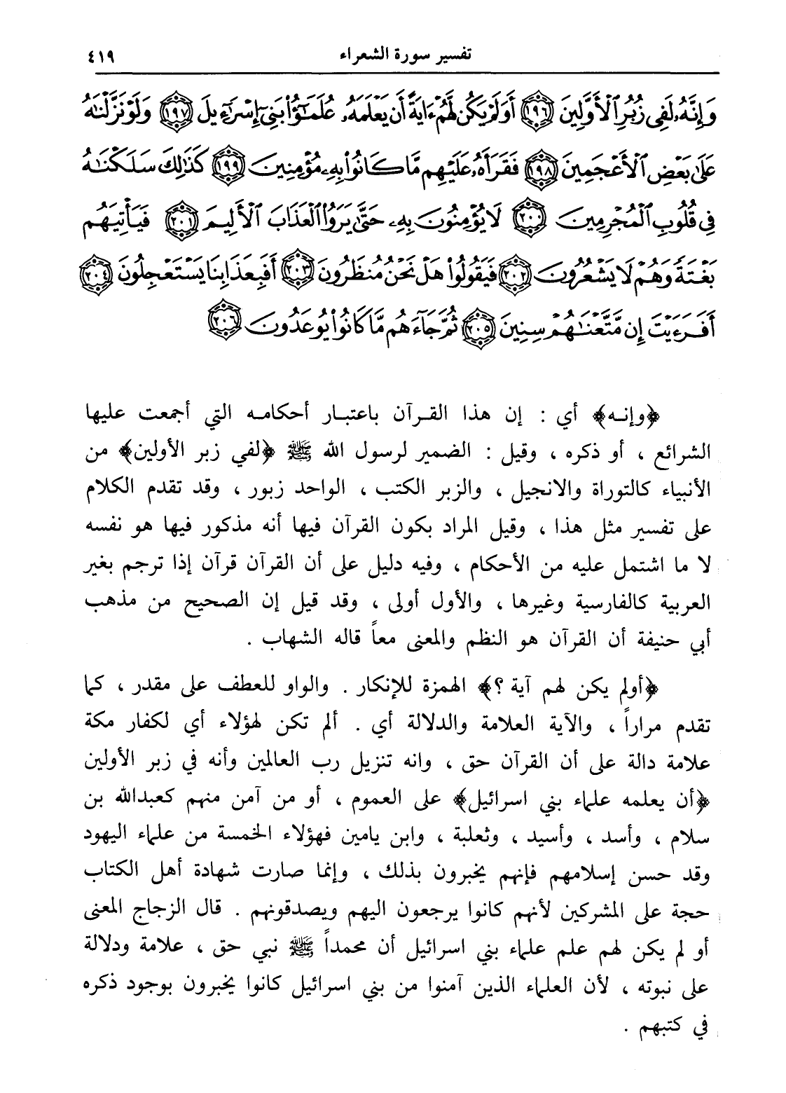 وَإِنَّهُ لَفِي زُبُرِ الْأَوَّلِينَ (196) أَوَلَمْ يَكُنْ لَهُمْ آيَةً أَنْ يَعْلَمَهُ عُلَمَاءُ بَنِي إِسْرَائِيلَ (197) وَلَوْ نَزَّلْنَاهُ عَلَى بَعْضِ الْأَعْجَمِينَ (198) فَقَرَأَهُ عَلَيْهِمْ مَا كَانُوا بِهِ مُؤْمِنِينَ (199) كَذَلِكَ سَلَكْنَاهُ فِي قُلُوبِ الْمُجْرِمِينَ (200) لَا يُؤْمِنُونَ بِهِ حَتَّى يَرَوُا الْعَذَابَ الْأَلِيمَ (201) فَيَأْتِيَهُمْ بَغْتَةً وَهُمْ لَا يَشْعُرُونَ (202) فَيَقُولُوا هَلْ نَحْنُ مُنْظَرُونَ (203) أَفَبِعَذَابِنَا يَسْتَعْجِلُونَ (204) أَفَرَأَيْتَ إِنْ مَتَّعْنَاهُمْ سِنِينَ (205) ثُمَّ جَاءَهُمْ مَا كَانُوا يُوعَدُونَ (206)